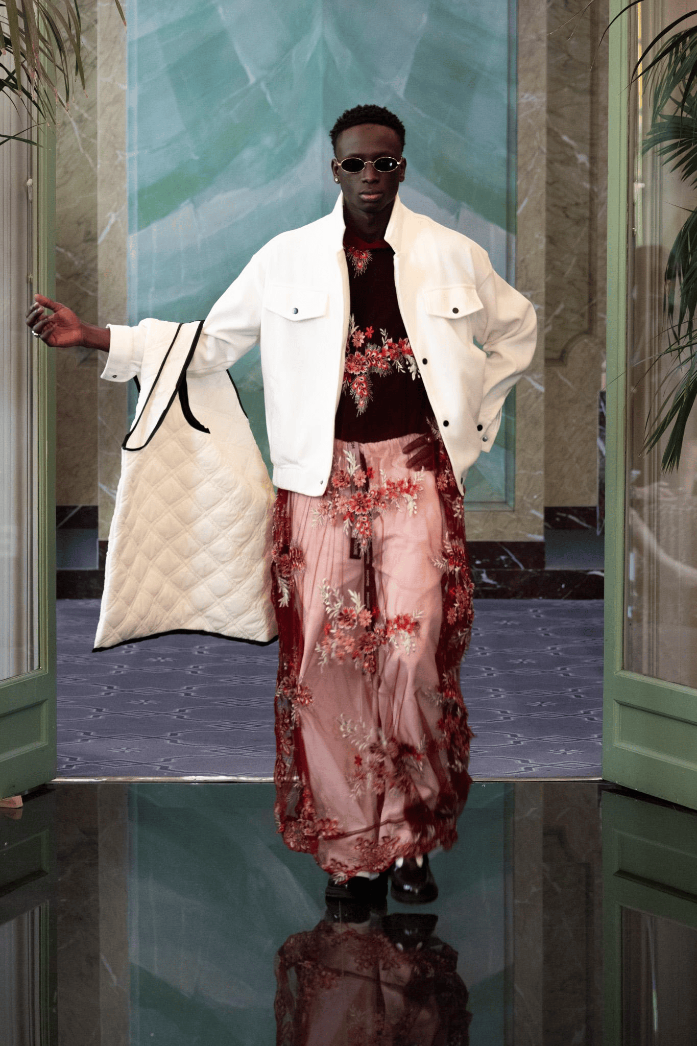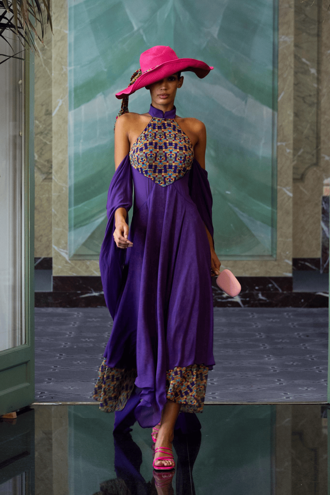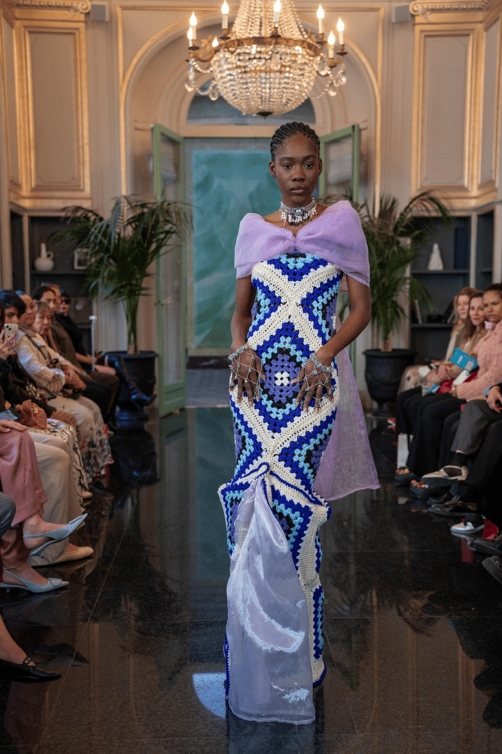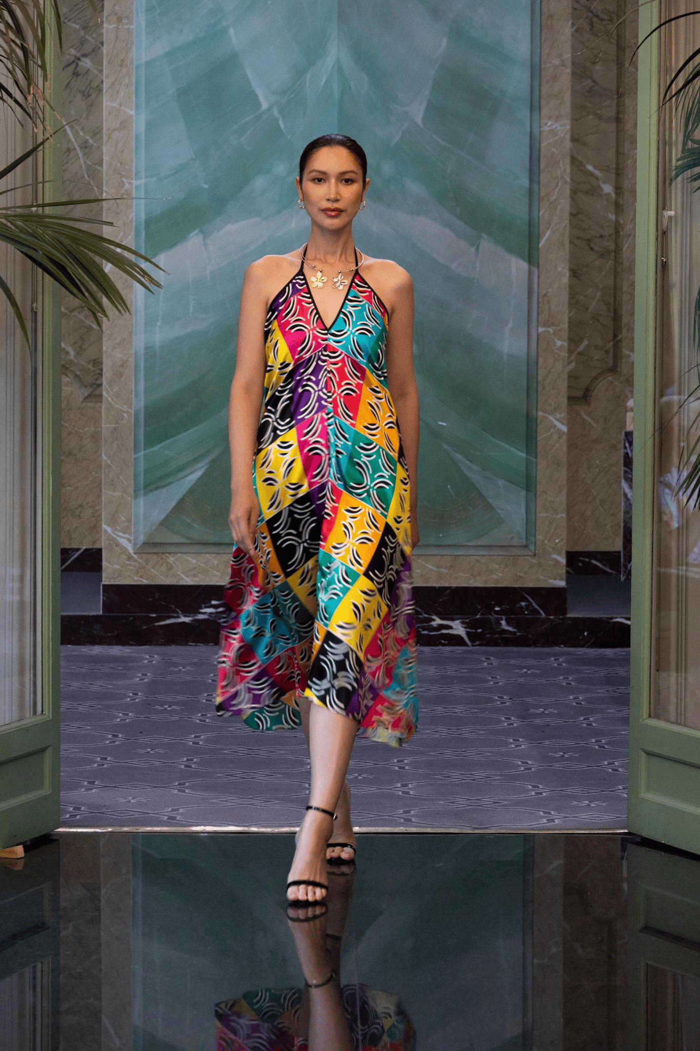 本季的亮点之一,是印花与材质的诗意交融。设计师们以极富实验性的方式重释经典面料:丝绸的流光、地中海色调的印染、非洲几何的强烈节奏,共同构筑出一幅跨越地域与文化的视觉画卷。轻盈的丝绸在光影下泛着微光,柔顺却有力量;印花不再只是表面装饰,而是成为表达情绪与身份的载体。不同文化语境下的布料在 Flying Solo 的舞台上对话,呈现出一种无声的全球共感。
