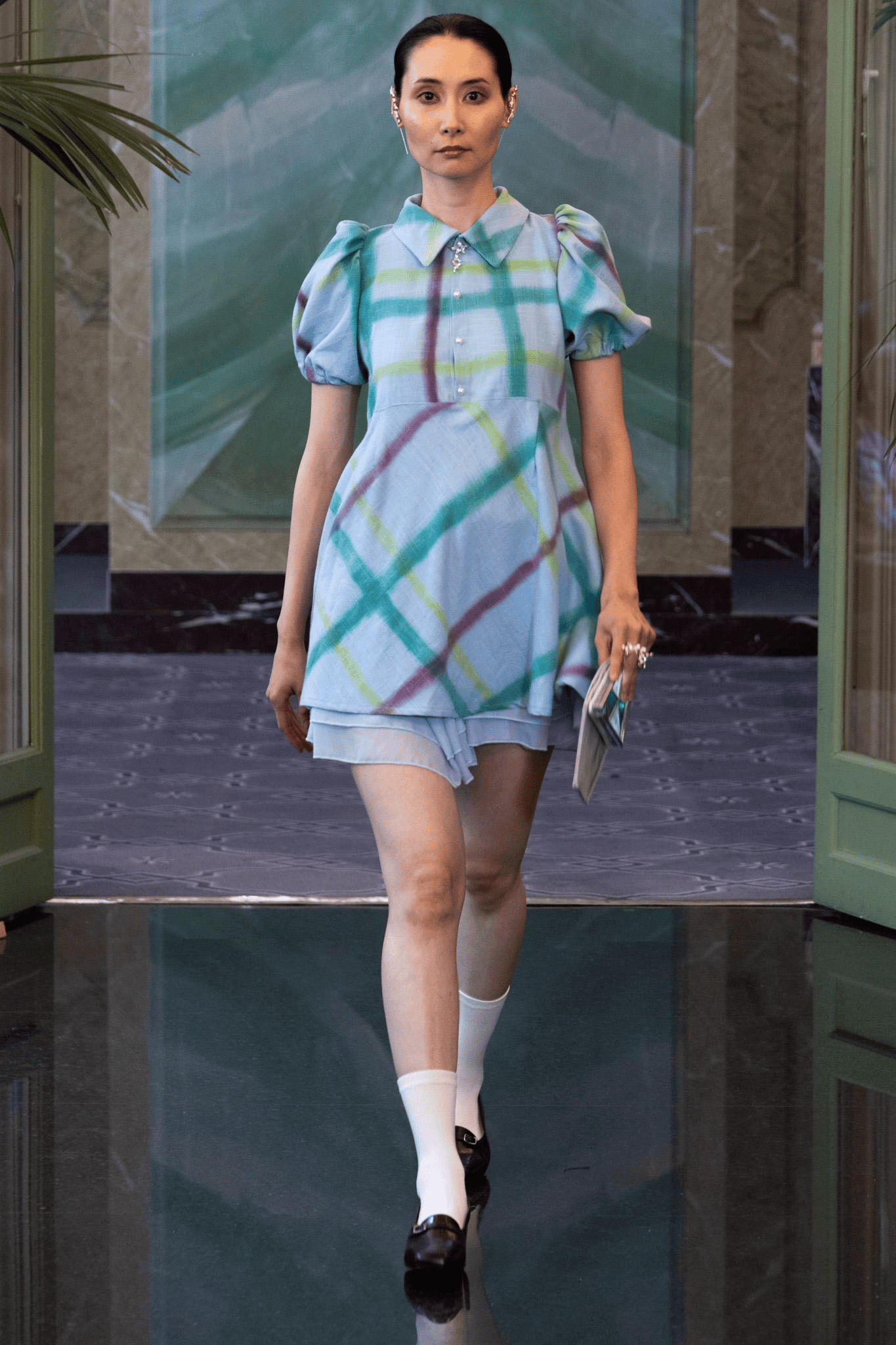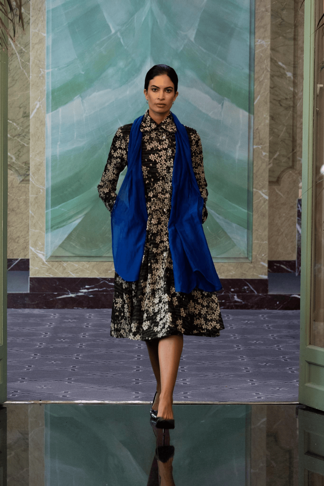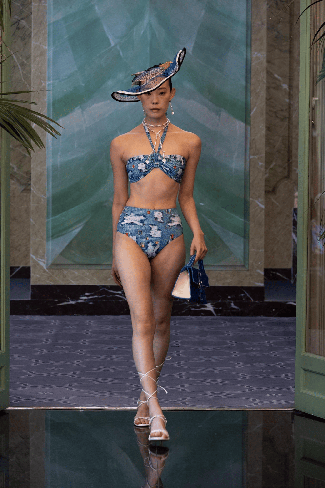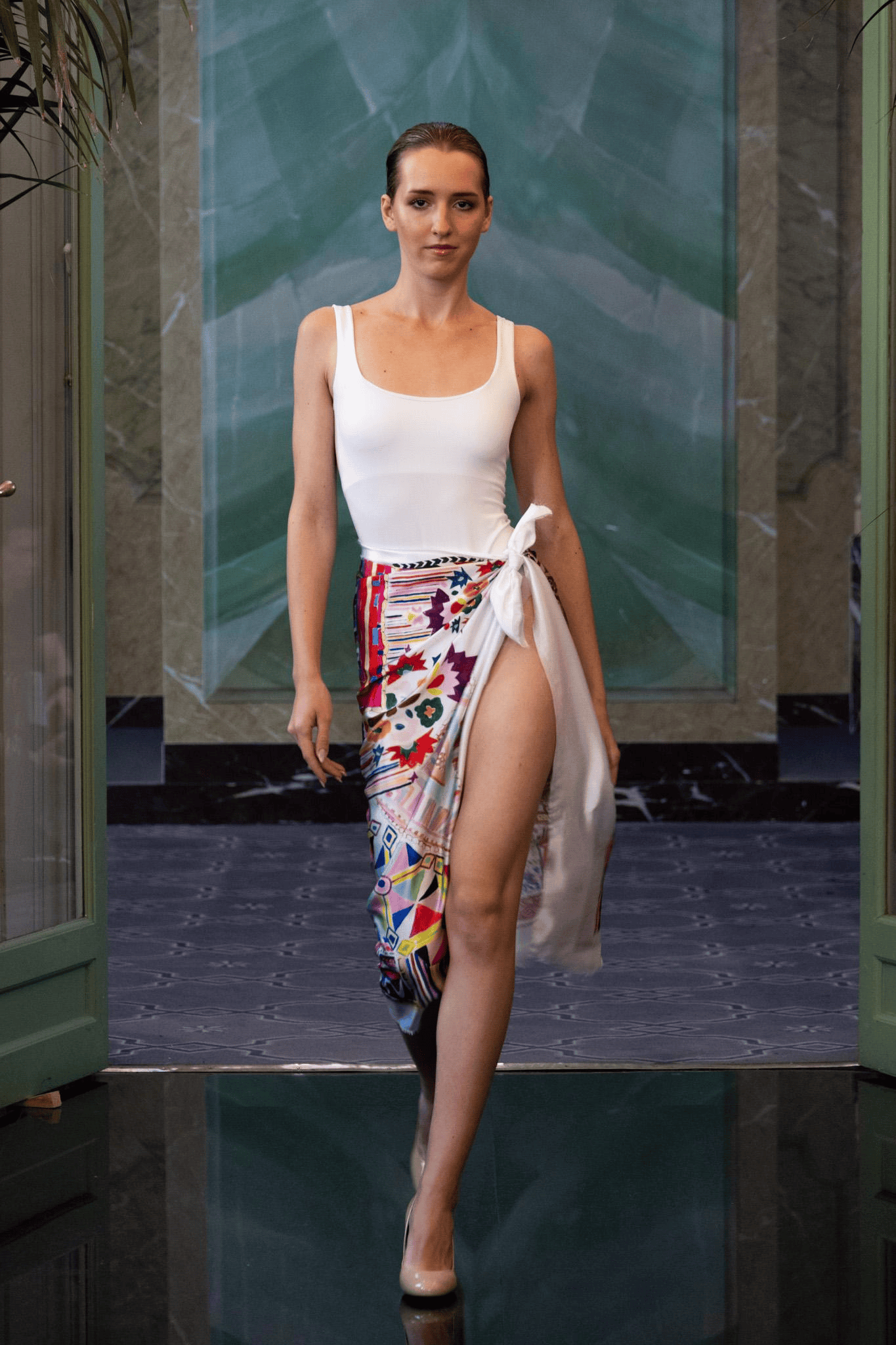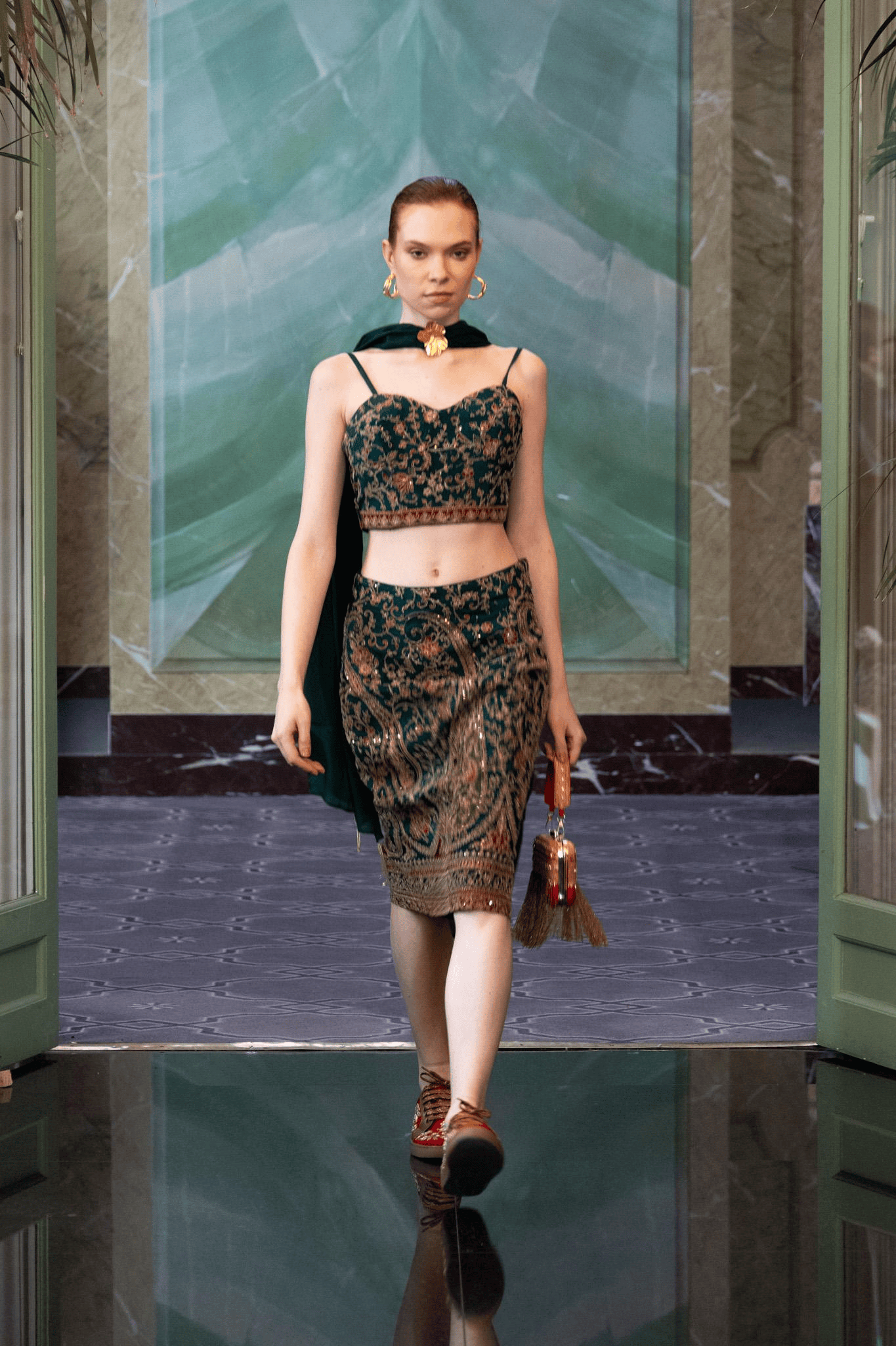 本季的亮点之一,是印花与材质的诗意交融。设计师们以极富实验性的方式重释经典面料:丝绸的流光、地中海色调的印染、非洲几何的强烈节奏,共同构筑出一幅跨越地域与文化的视觉画卷。轻盈的丝绸在光影下泛着微光,柔顺却有力量;印花不再只是表面装饰,而是成为表达情绪与身份的载体。不同文化语境下的布料在 Flying Solo 的舞台上对话,呈现出一种无声的全球共感。