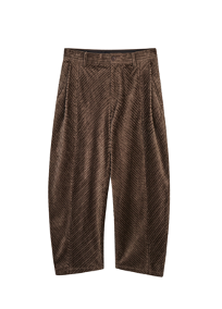 与同系列大衣呼应的子母条灯芯绒弯刀裤,采用速写标志性的弯刀裤裤型,裤头利落干净,裤身带建筑感弧度,不挑身形却极具风格与松弛感。选用同样的子母条灯芯绒面料,独特的肌理与光泽为冬日穿搭注入复古温度。