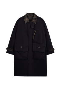 Barbour改良长款风衣灵感源自英伦乡野文化的Barbour外套,衣领拼接撞色皮革,保留其经典视觉元素,配以绛红与黑色及黄铜色金属配件,视觉上打造超强复古感。三个大容量工装口强化其功能性,胸前独具匠心的贝壳曲线立体口袋,又为实用主义注入诗意想象,为穿着带来更多趣味。