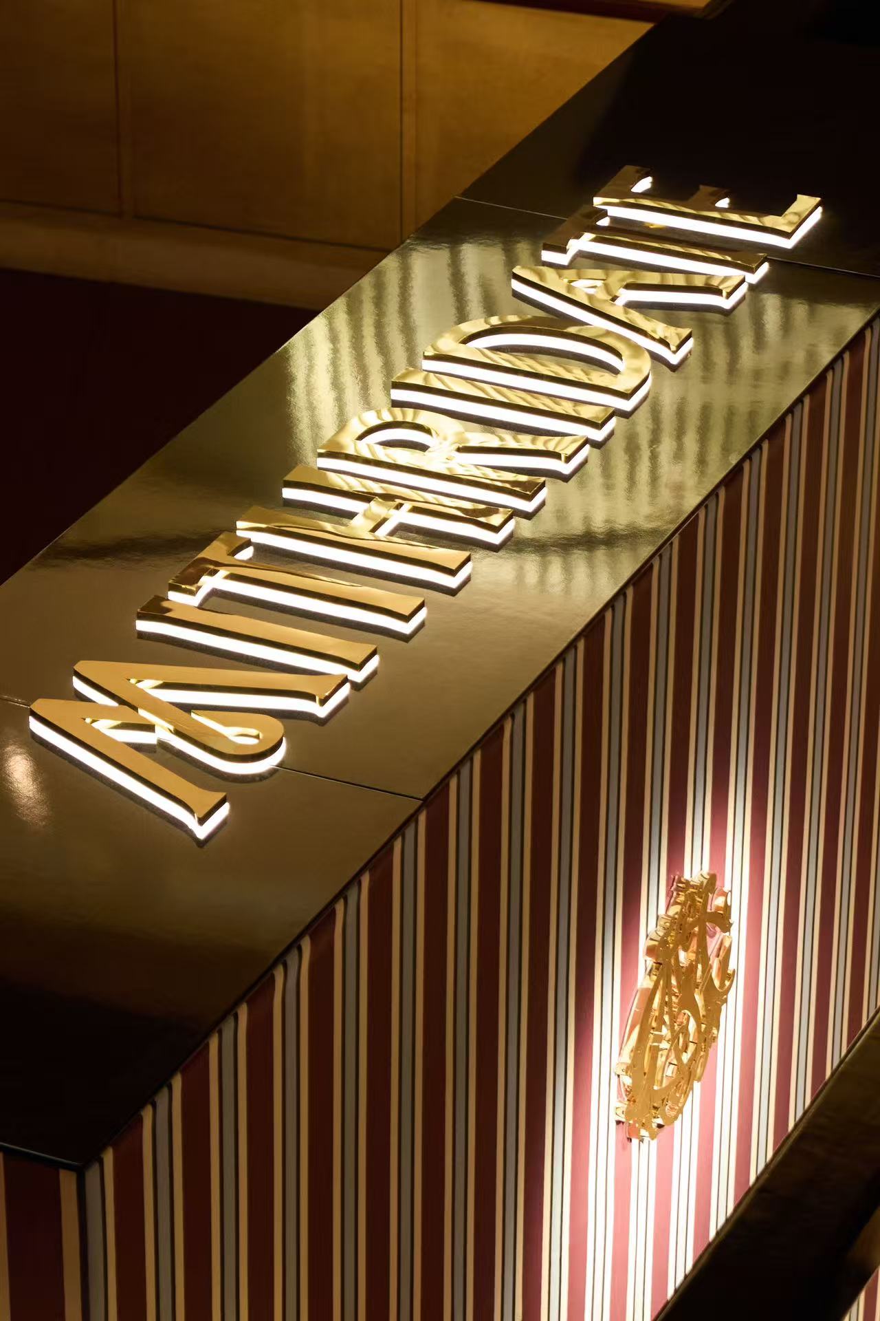 快闪空间的设计灵感源自传统英式店铺的外观立面,尤以伦敦萨维尔街与杰明街的经典街区为典范,精湛的定制裁缝工艺在此延续与传承。店铺外立面以亮面黑色漆面呈现,与柔和的胡桃木质内饰及店铺中央醒目的条纹立面相映成趣,营造雅致而分明的空间层次。