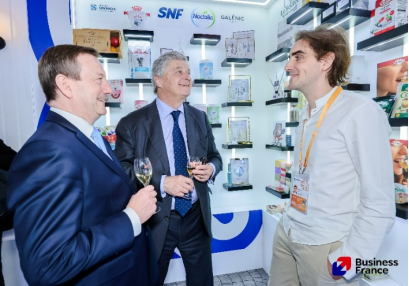 图注:左一法国驻华大使白玉堂先生(Bertrand Lortholary)及左二法国欧洲和外交部部长下属主管外贸和吸引力部长级代表尼古拉·弗里西耶先生(Nicolas Forissier)共同参观品牌展位