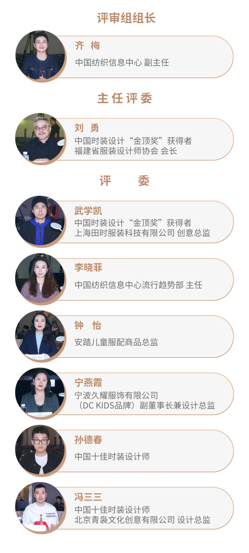 参与本届大赛终评的评审团阵容堪称行业翘楚,汇聚了国内童装设计、时尚创意与品牌研发领域的顶尖力量。评审组组长由中国纺织信息中心副主任齐梅担任;主任评委为中国时装设计“金顶奖”获得者、福建省服装设计师协会会长刘勇。评审团队还包括中国时装设计“金顶奖”获得者、上海田时服装科技有限公司创意总监武学凯;中国纺织信息中心流行趋势部主任李晓菲;安踏儿童服配商品总监钟怡;宁波久耀服饰有限公司(DC KIDS品牌)副董事长兼设计总监宁燕霞;中国十佳时装设计师孙德春;中国十佳时装设计师、北京青袅文化创意有限公司设计总监冯三三。