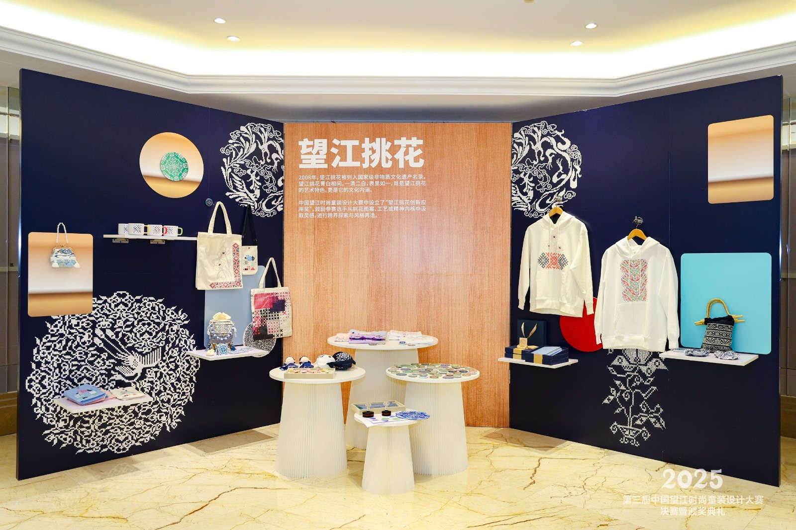在活动现场,“望江挑花”创新应用展示区备受关注。该展区以安徽望江非遗技艺“望江挑花”为主题,重点呈现了鲁美·文化国际服装学院蒋卓君院长与其学生团队的设计创意成果。他们从传统挑花纹样中汲取灵感,通过色彩重构与现代设计语言,将素雅纹样转化为富有青春活力的日常用品。展品涵盖卫衣、帆布袋、手饰、玩偶及各类文创产品,在细节中延续非遗工艺的精致与温度。这一创作实践,不仅让“望江挑花”焕发新生,也推动传统文化以更鲜活、亲切的姿态走进当代生活。