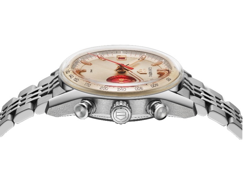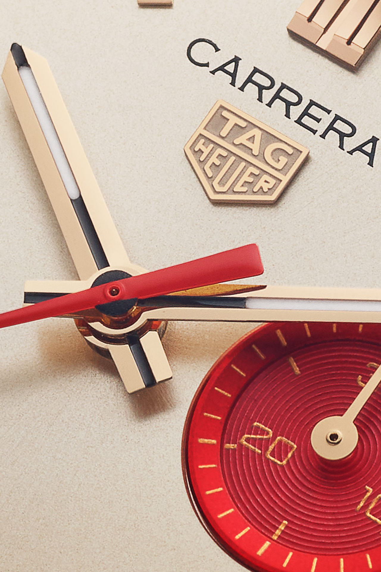 作为为赛道而生的经典系列,卡莱拉此次仍以硬核工艺诠释速度美学。全新泰格豪雅卡莱拉系列马年计时码表,采用经典39 毫米的 Glassbox 表壳设计,搭配镀18K 5N玫瑰金材质装饰的指针与时标,并以华丽红色点缀细节,打造出和谐统一感。腕表配备专属米粒式表链,链带经过精细拉丝与抛光处理,不仅在视觉上极具张力,同时也兼顾了人体工程学的佩戴舒适度,与卡莱拉系列标志性的修长表耳设计相得益彰。
