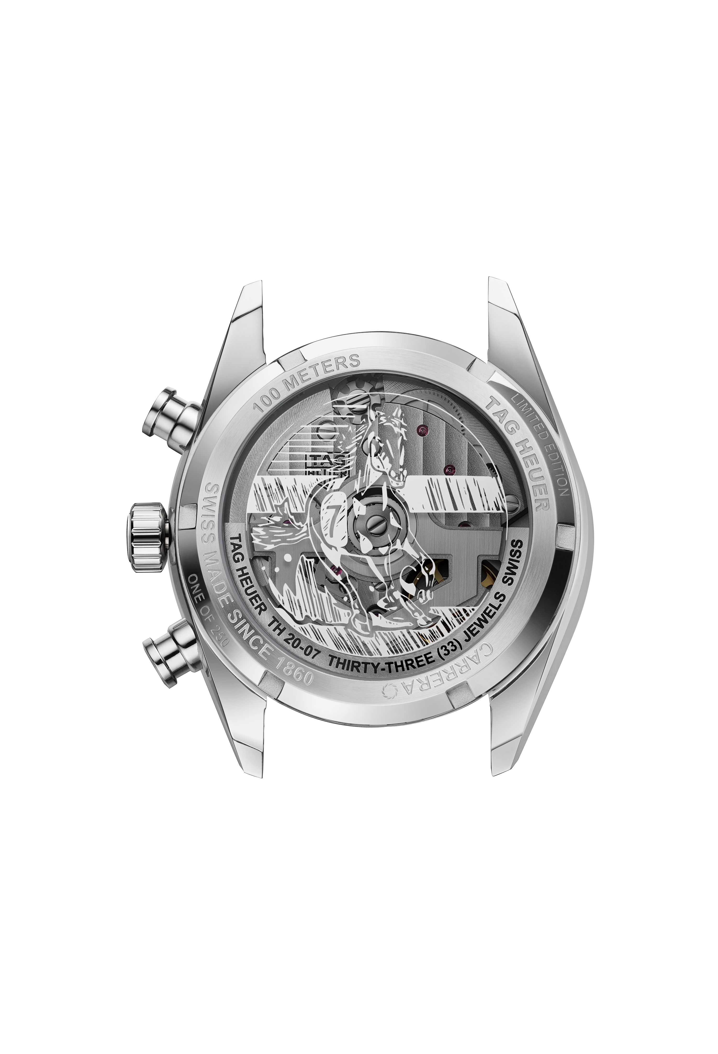 透过蓝宝石水晶底盖,腕表搭载的品牌自制TH20 - 07 机芯的精妙运作一览无余,底盖中央奔马图腾,既象征着不受束缚的磅礴力量,亦致敬卡莱拉系列源自赛车运动的竞速基因。这款机芯性能卓越,具备 80 小时动力储备,确保在剧烈运动状态下仍能持续精准运行。经双面防眩目处理的穹顶状蓝宝石表镜与弧形表盘外缘设计,有效消除了视差干扰,即使在高速运动场景下,佩戴者也能清晰准确读取时间。