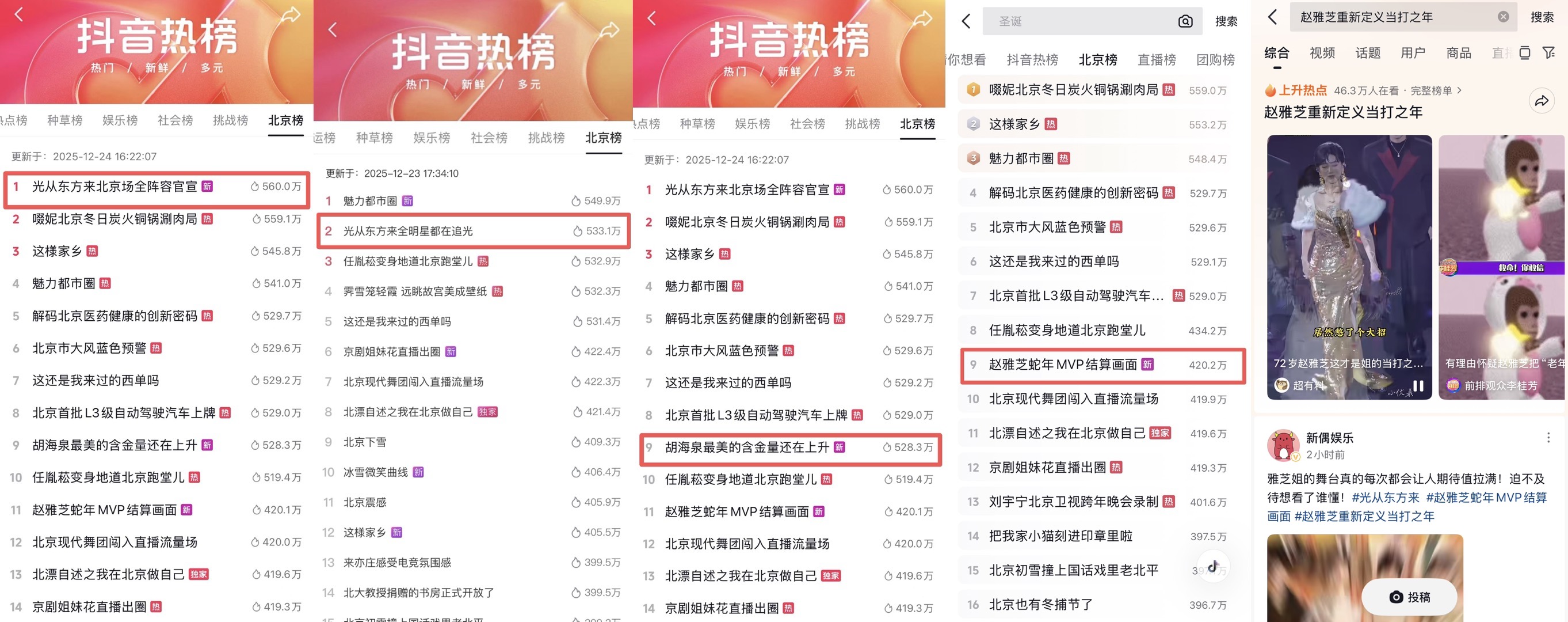 除此之外,胡海泉的新编版《最美》《心似狂潮》、张碧晨《浮生谁》演绎东方美学、黄英和郭浩然合唱的《烽月》、王搏《丽丽》、以及yoyo 与颢鑫的《一期一会》等,这些或动感或深情或魔性,治愈又甜蜜的歌曲,承包了网友的笑点、泪点和燃点,让晚会真正成为一场年终总结式的音乐盛宴,弹幕里“全程高能”“年度最佳”“2025的电就充到这里了,准备好迎接新年啦”好评不断刷屏。晚会结束后,在抖音、微博等多个社交平台上,晚会相关内容的讨论度仍居高不下。其中 话题#胡海泉跳喵喵舞游刃有余 强势登上抖音热榜北京榜第一位。 话题#她可是赵雅芝啊#冲上微博文娱榜和主话题榜。