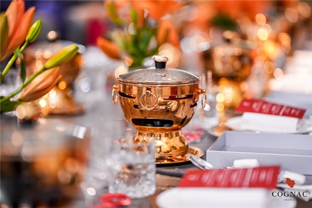 “京”“邑”求精,取“精益求精”之意,彰显干邑在风土培育、酿造工艺上的极致追求,亦喻指中法文化在十六载交流中不断碰撞融合、愈发精深。活动现场以“铜”为线索,酿造干邑的夏朗德铜质蒸馏壶历经数百年传承,以其独特工艺汇集酒液精华;而北京铜锅涮肉的铜锅,则承载着老北京饮食文化的烟火气。二者虽分属中法,却同为 “铜器赋能风味” 的经典载体。活动伊始,嘉宾在定制铜画前以锤轻敲画作。这一仪式也喻示干邑与中国火锅二者皆是依托铜器之功,在时间与火候中凝炼风味,成就餐桌上的艺术,是中法文化深度交流的生动注脚。