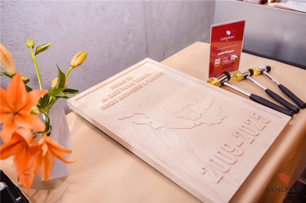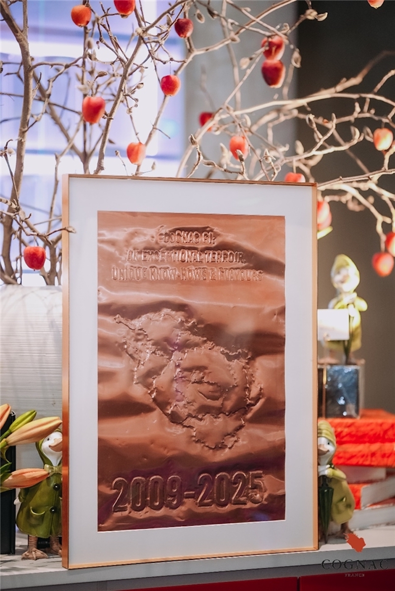 干邑地理标志在华认证十六载荣光之际,法国农业参赞(农业及食品企业发展和合作)Max MONOT先生与法国国家干邑行业管理局中国区首席代表李滢女士上台完成了拓铜版画的正式揭幕。这幅镌刻了整个干邑区域轮廓的铜画不仅是一件融合中法铜艺精神的艺术创作,更是两地技艺交流、文化互鉴的见证,呼应着从2009年干邑成为首个在华获认证的国外地理标志(GI)至今,双方在产权保护与品质推广上持续深化的合作。