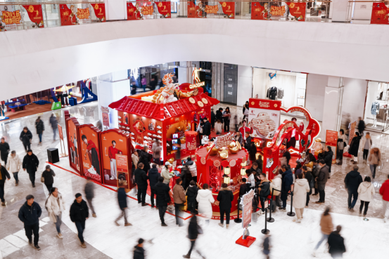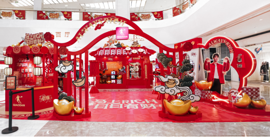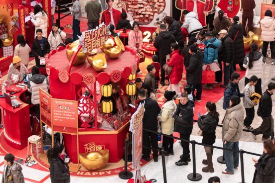 本次活动的最大亮点之一,即中乔体育全力打造的“日日有财-马年游乐园”。以新年红、生肖马元素和金币元素为主,将快闪现场打造成一座沉浸式游乐园——“招财马”神气十足,点缀其间的青松、元宝以及新中式传统纹样等诸多新年符号,交织出年味浓郁的视觉景观。