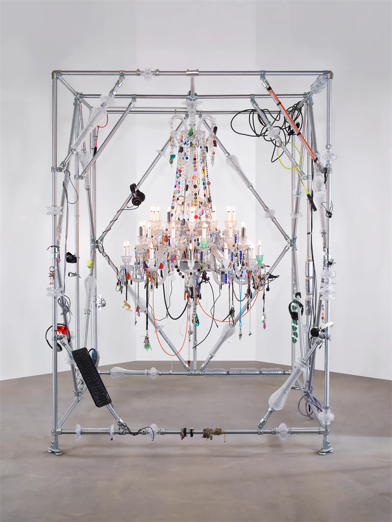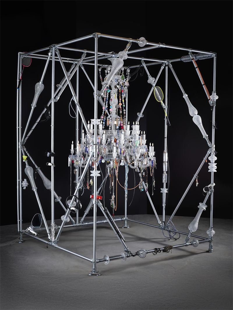 Baccarat巴卡拉以光为语言,将原材料转化为璀璨水晶。1850 年,巴卡拉推出天顶系列枝形吊灯,自此成为品牌的标志性系列之一。近两个世纪后,哈里·努里耶夫以颠覆性诠释重塑这一经典,将天顶蜕变为一件融合水晶美学与日常元素的艺术杰作。金属结构借用水晶吊灯的元素进行装饰,延伸作品形态,成为不可或缺的组成部分。与此同时,钢笔、珠宝、瓶盖、钥匙扣、CD 等来自日常生活的物品被巧妙融入整体创作,与扭状灯臂、“鸢尾花”装饰、箭头状棱柱、小铃铛、八角形珠链等天顶经典元素展开一场跨越时空的对话。这件装置作品既宏伟又温馨,为参观者开启一场模糊功能、创造与情感界限的沉浸式体验。