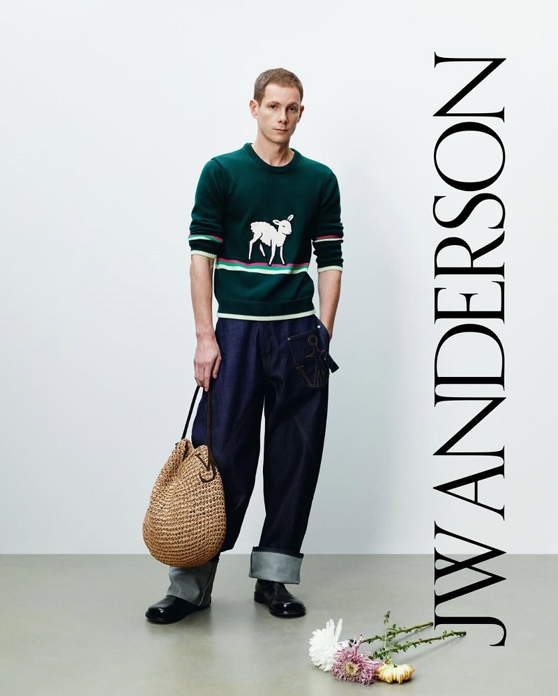 JW ANDERSON标志性的、略显怪诞而充满创意的经典单品——飞行夹克、打结连衣裙、趣味针织,以及“不那么基础”的基础款——都以一种轻快而自然消解性别界限的态度焕新回归。配饰系列亦随之演变:Anchor Tote加入图案处理,而Loafer Bag则以松绿色鳄鱼皮材质呈现全新版本。