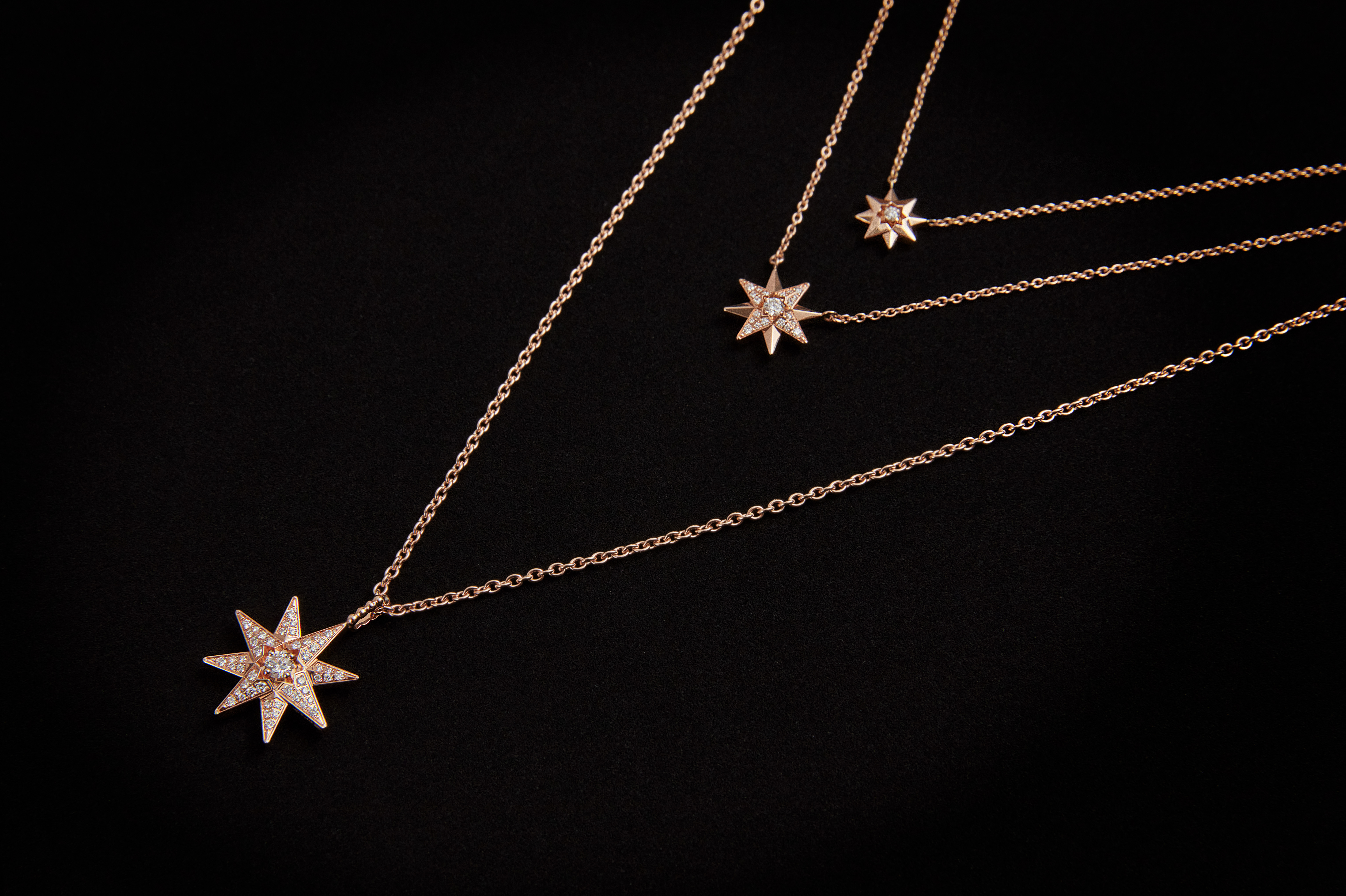 时光流转,风尚绎新。本季,Rose des vents系列再度启程,为匠心臻作注入崭新灵感,续写这段永不停息的探索之旅:Rose des vents系列甄选象征力量与宁静的黑色缟玛瑙演绎新作,谱写能量与情感交融的谐美诗篇;Étoile des Vents系列则以白金材质打造幸运八芒星,携自由之姿,诠释现代美学;璀璨钻石令玫瑰金与白金项链和手镯散发夺目光辉,将Rose des vents与Étoile des Vents系列交织成趣。