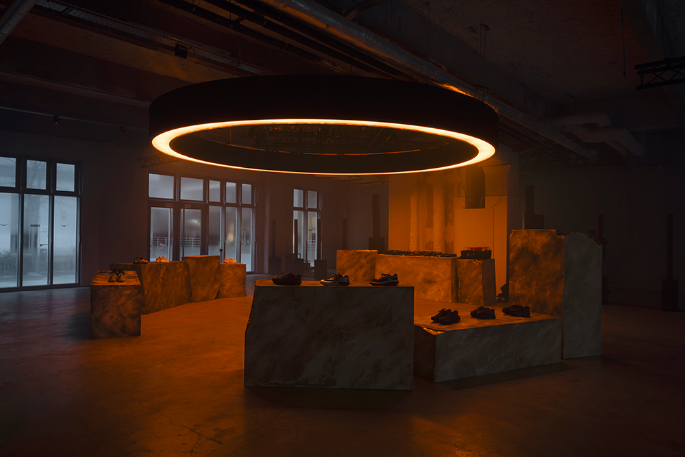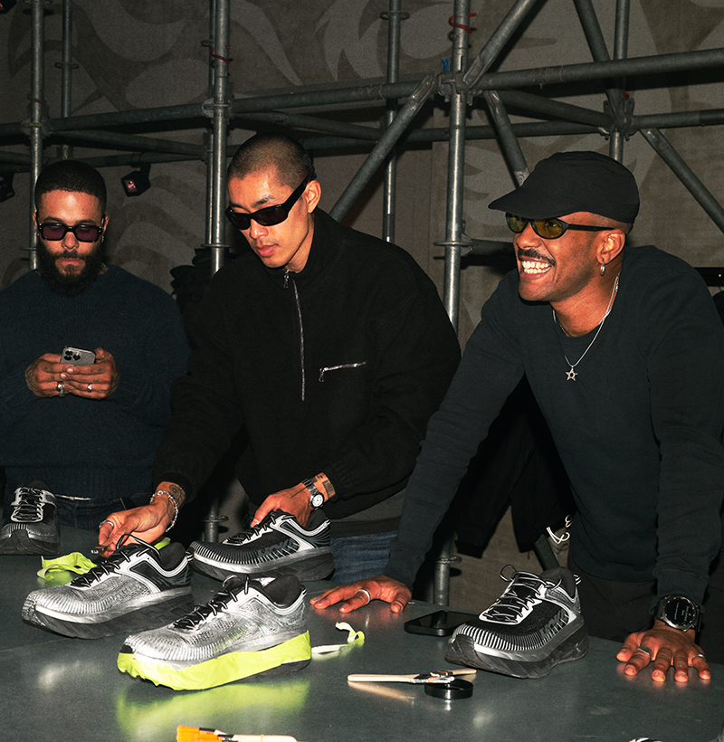 以太阳为灵感,体验空间以环形灯光装置与天然矿石展台呈现品牌对自然与运动的本源探索;灯带随时间流转不断变换,以日落地平线的光影意境巧妙呼应主题「New Horizons」,为HOKA时尚新篇埋下伏笔。展台上陈列HOKA 2026春夏系列新品,其中包含将于2月1日正式发售的全新STEALTH/TECH系列——该系列以黑、白、银极简色调,对 MAFATE SPEED 2、SPEEDGOAT 2 与 BONDI 7 三款经典鞋型进行焕新演绎,简约高级质感融合反光细节,无论昼夜都极具辨识度,直观诠释HOKA功能性与先锋美学的共生。此外,活动特设定制创意工坊,将个性表达融入时尚创作,让每一件HOKA产品都成为承载自我态度的独特载体。