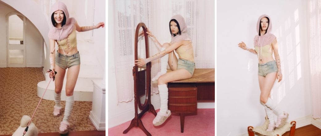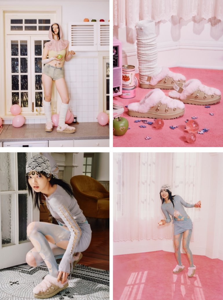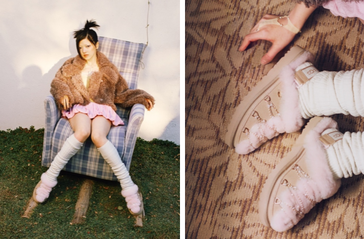 设计师RUI在UGG经典鞋款的基础上,巧妙融入了细腻却又彰显能量的设计语言。粉色毛绒元素的装饰性运用与精致珍珠串细节的加入,为整体设计增添了温柔细腻而富有松弛感的叙事层次。额外加入专属设计的珍珠堆堆袜,丰富造型搭配。整体既有UGG一贯的温暖茸感,又增添了RUI特有的灵动与张力。这种材质与装饰的碰撞,诠释着“温柔与叛逆并存”的当代美学主张,让每一双鞋都如同一件可穿戴的艺术品,兼具如珠宝般的精致能量与日常穿着的舒适内核,书写属于自己的风格叙事。
