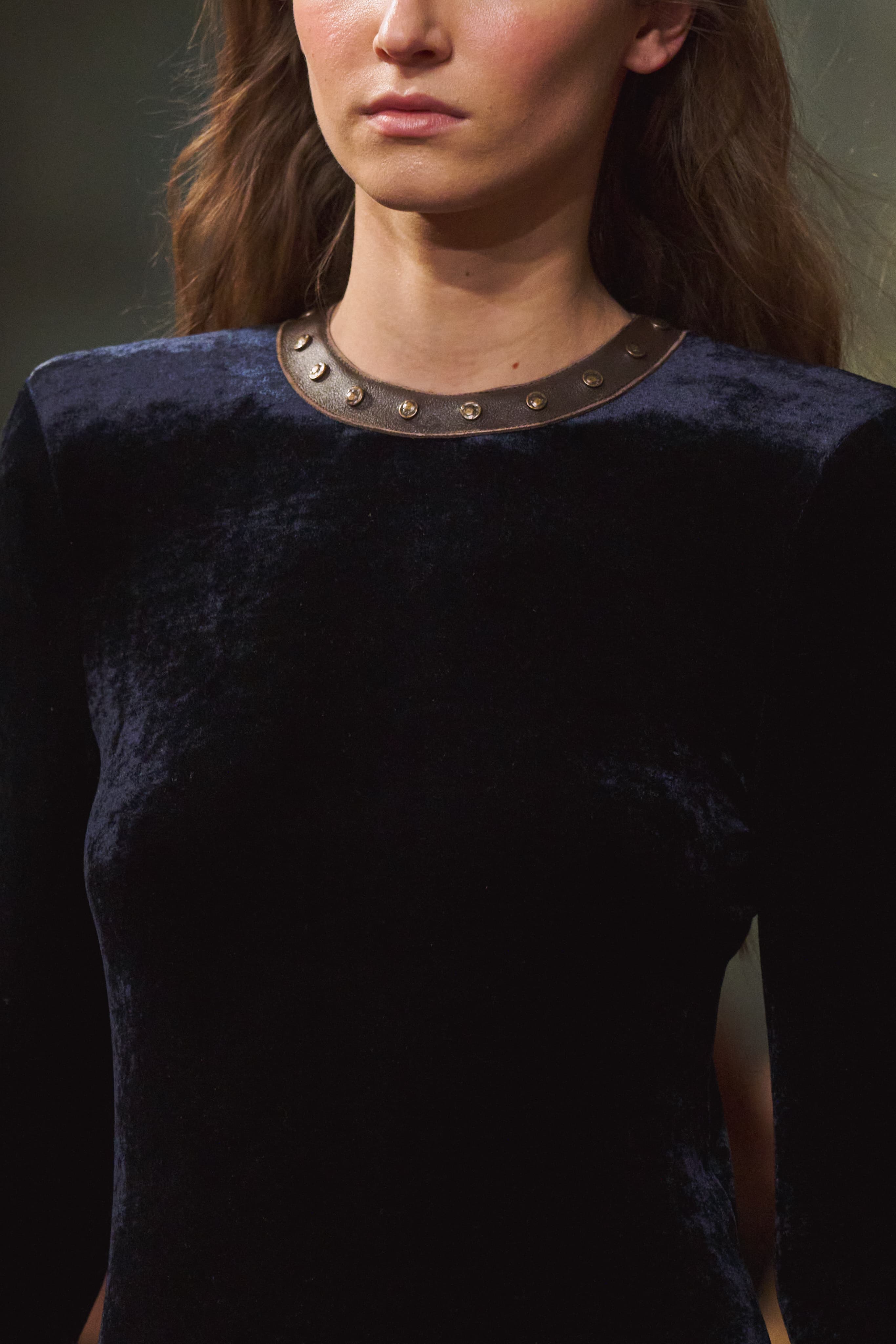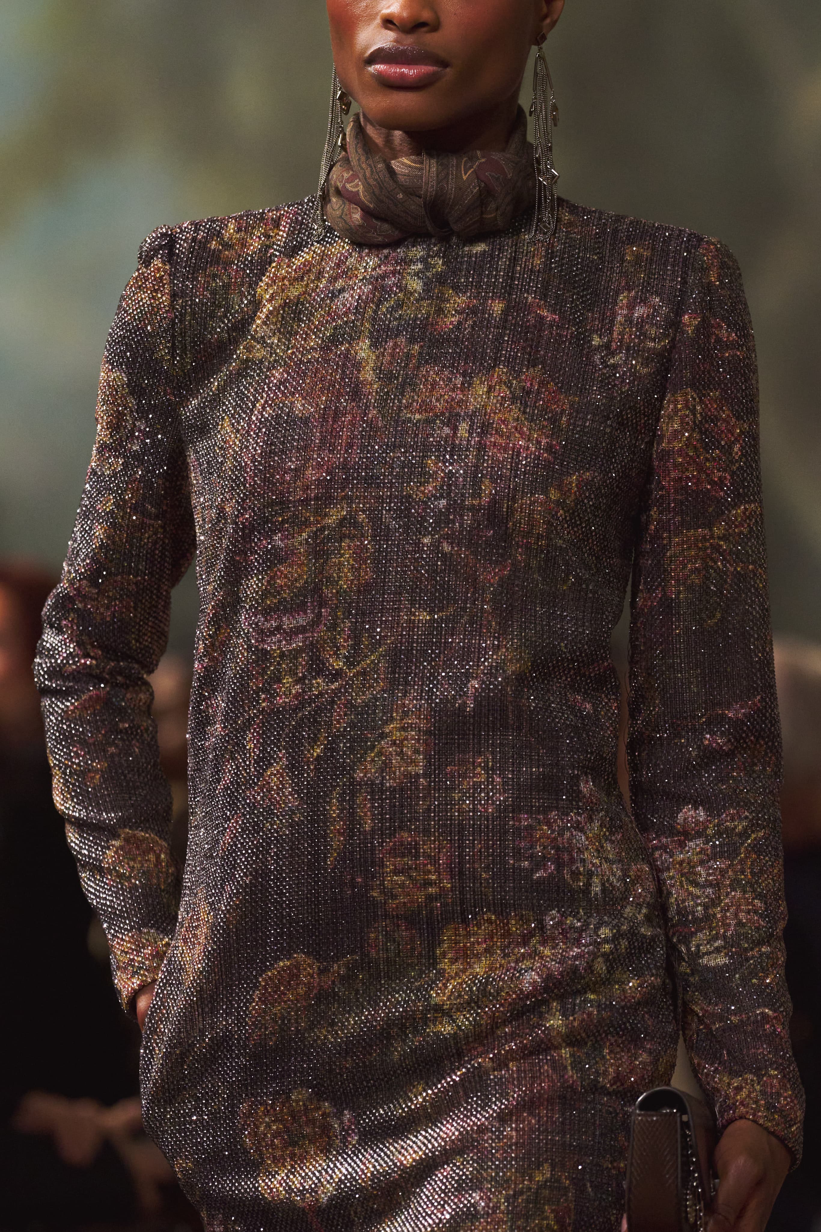 匠心工艺贯穿始终。高领微闪亮片长裙覆以植绒天鹅绒印花,勾勒深邃氛围;露背礼服的天鹅绒面料经由棕、深蓝双重浸染,呈现迷人光泽;一件极具艺术感的精致上衣,更融汇亮片刺绣、手绘、皮革贴花与玻璃珠流苏等多重手工艺,尽显匠心底蕴。