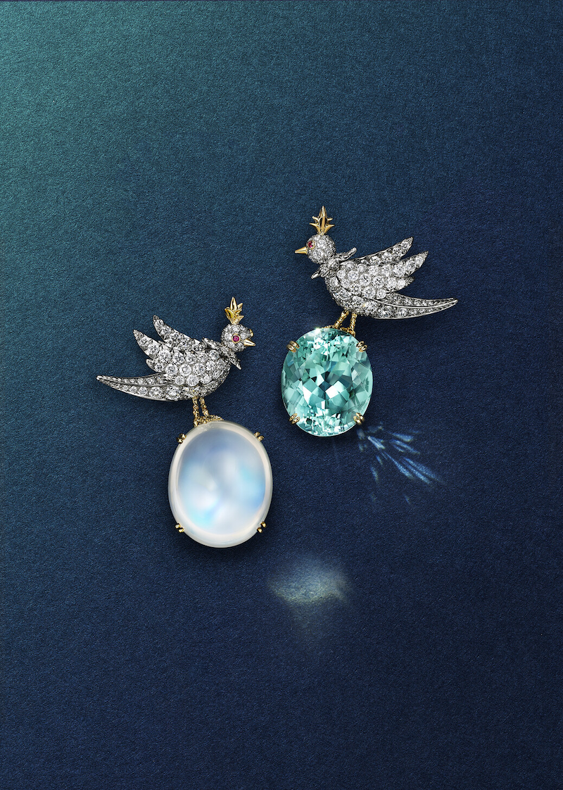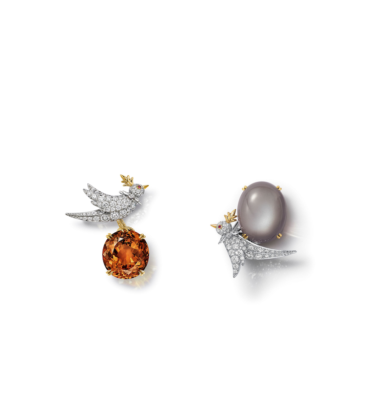 蒂芙尼让·史隆伯杰高级珠宝系列“石上鸟”棕色碧玺胸针及灰色月光石胸针