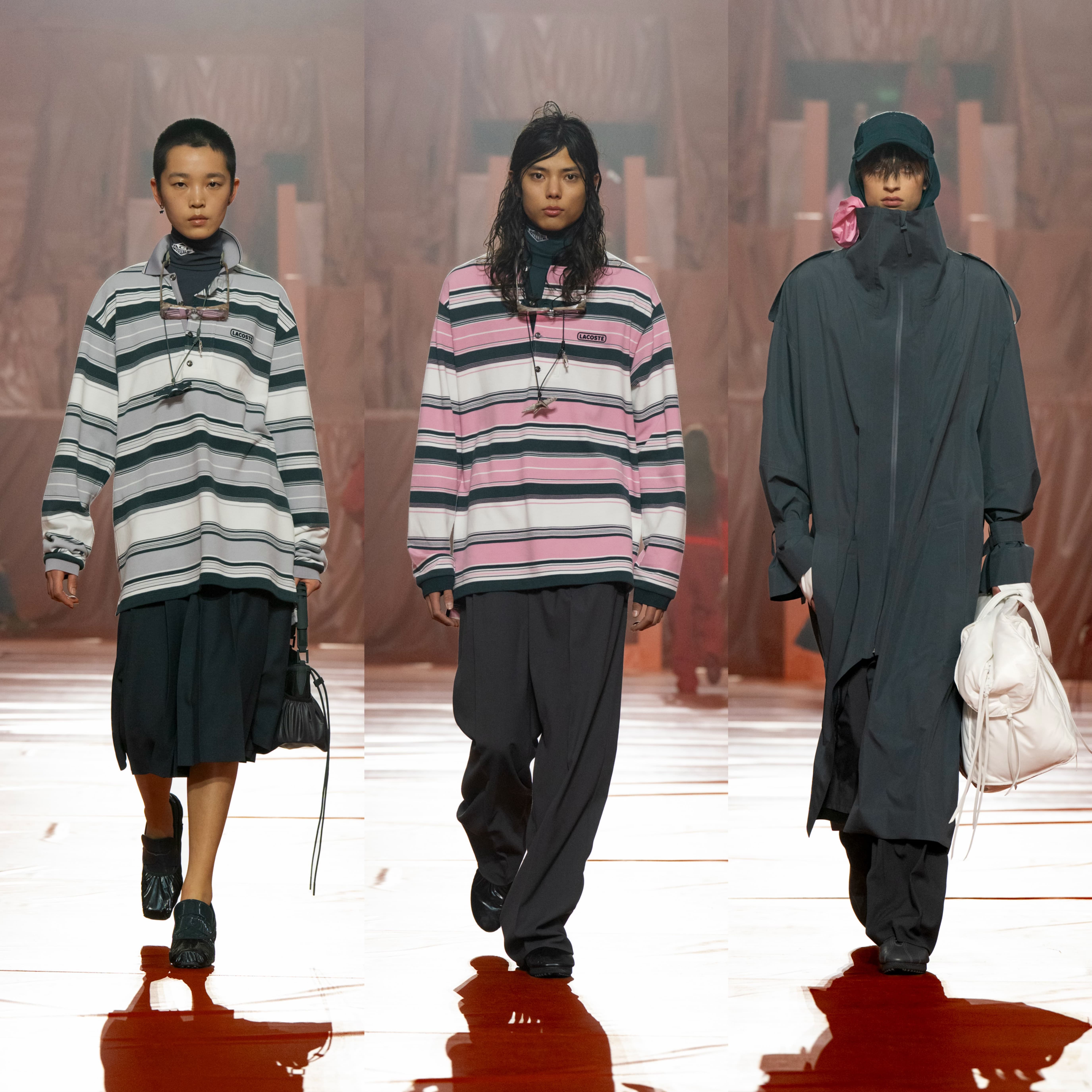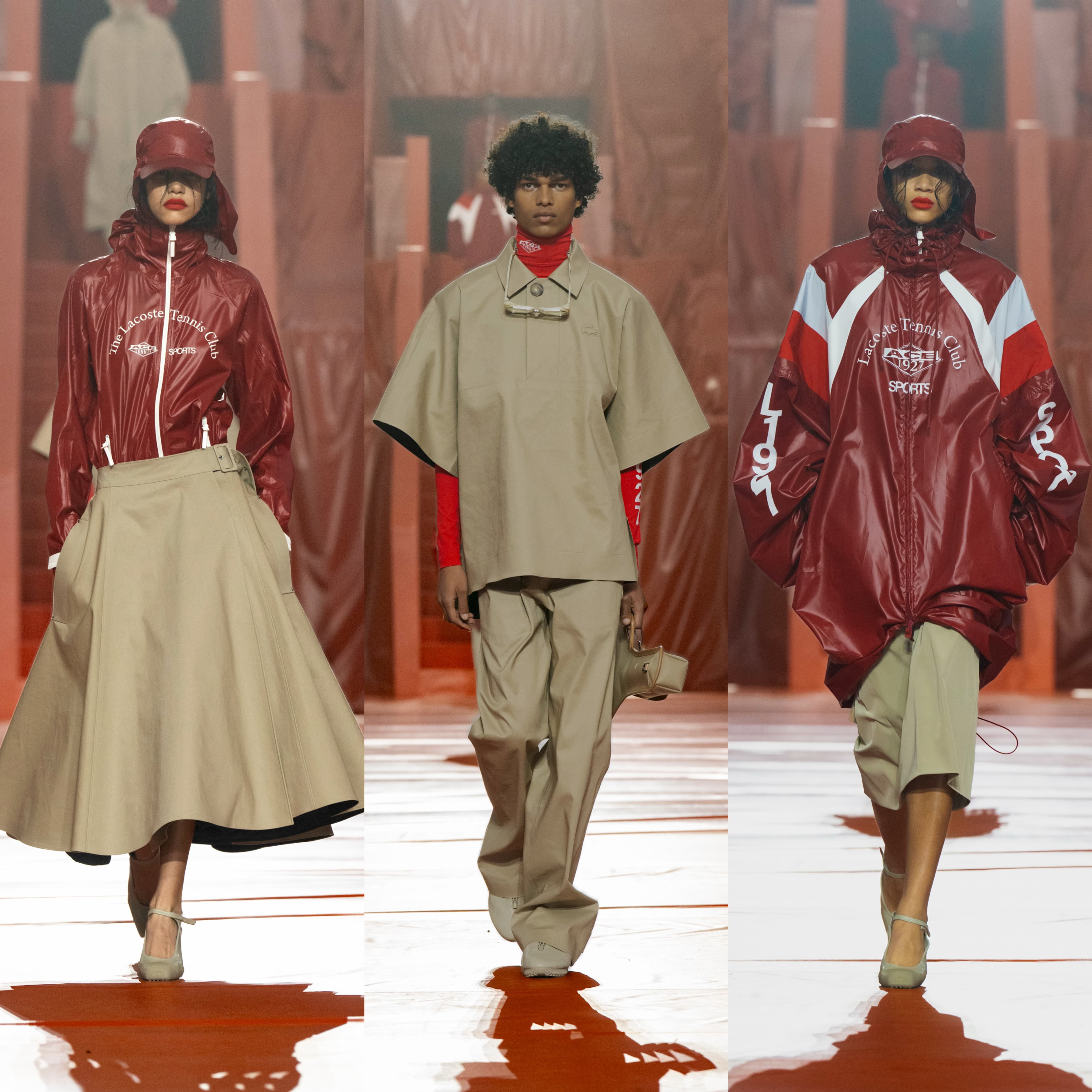 LACOSTE 2026 秋冬时装秀于罗兰·加洛斯体育场的菲利普·夏蒂埃球场盛大呈现,将球场化身为一场被暴雨中断的经典对决现场。