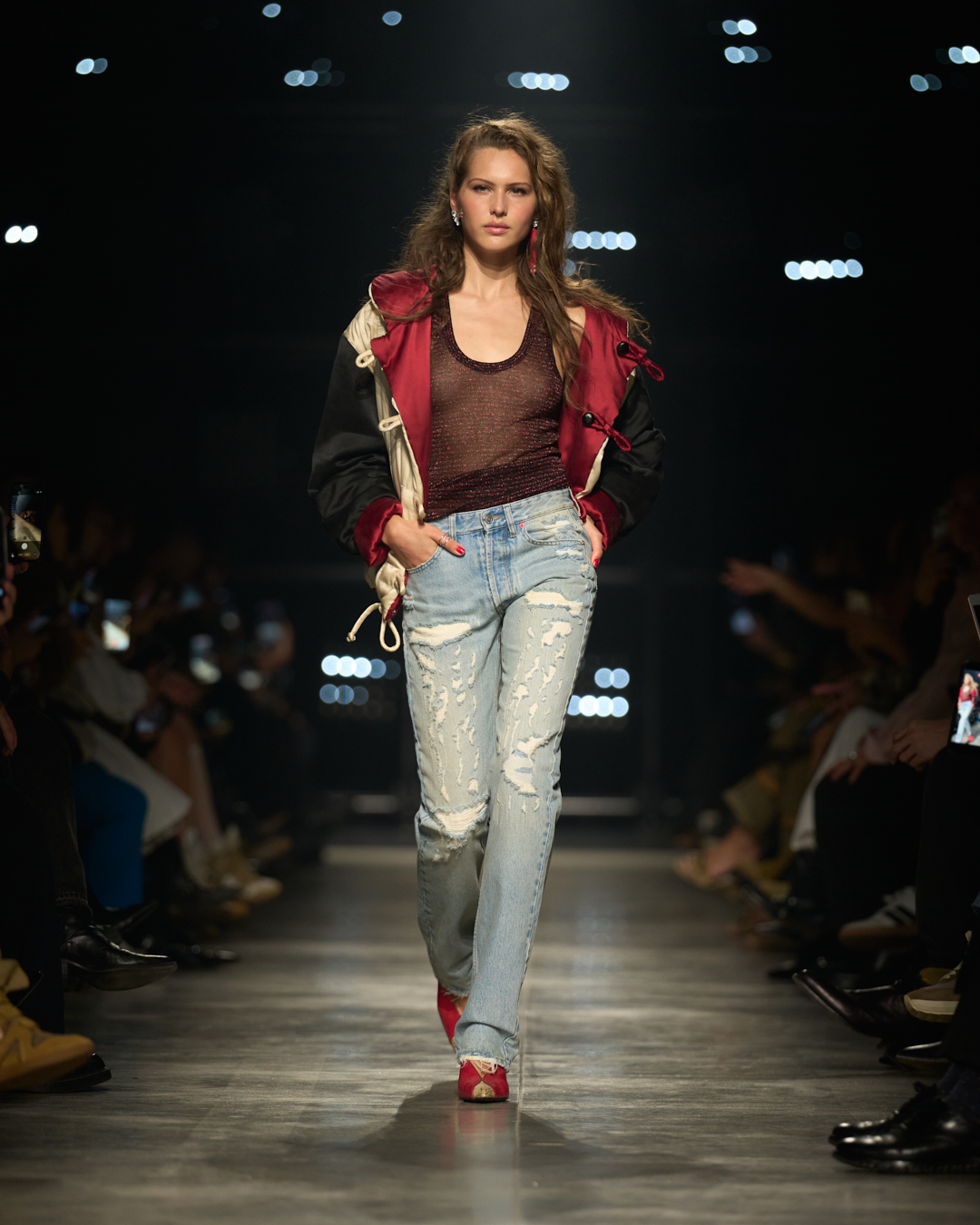 本季,硬朗与柔美交织相融,迸发蓬勃张力。半拉链高领针织衫、水手风绞花针织毛衣与超大纽扣飞行员外套展现 沉静态度,与透视薄纱连衣裙、刺绣紧身上装和锐利深口皮靴构成鲜明对比。