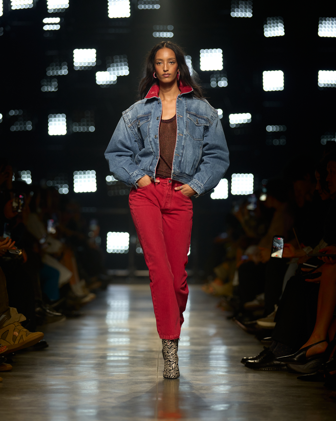 Isabel Marant以经典巴黎风尚诠释酷飒女性力量,利落牛仔裤搭配剪裁得宜的挺括皮 革夹克,于暗夜中尽显率性洒脱型格。