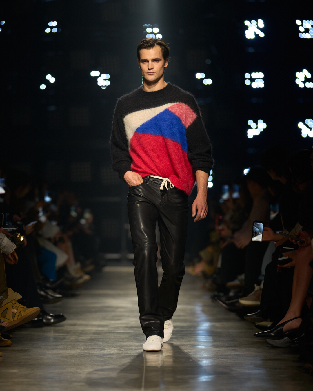 夜幕之下,Marant本季男装亦焕以相同格调。他是男友,是艺术家,亦或是演员,酷劲与魅力兼收并存。 褪色丹宁,阔肩皮革夹克,搭配仿旧麂皮靴或白色运动鞋,勾勒简洁流畅的纯粹线条。
