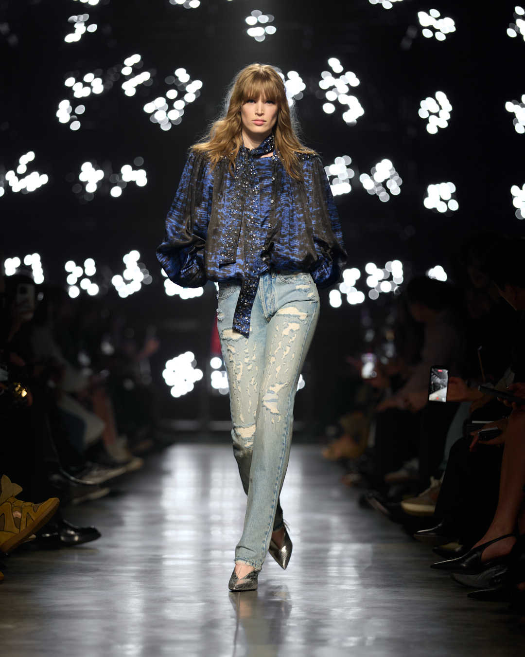 手工技艺升格本季衣橱。牛仔裤以刺绣工艺再现磨损效果;蓝色皮革衬衫融入精致镂空蕾丝装饰;靴履跟部经过 雕刻和仿旧处理,为整体造型定调。