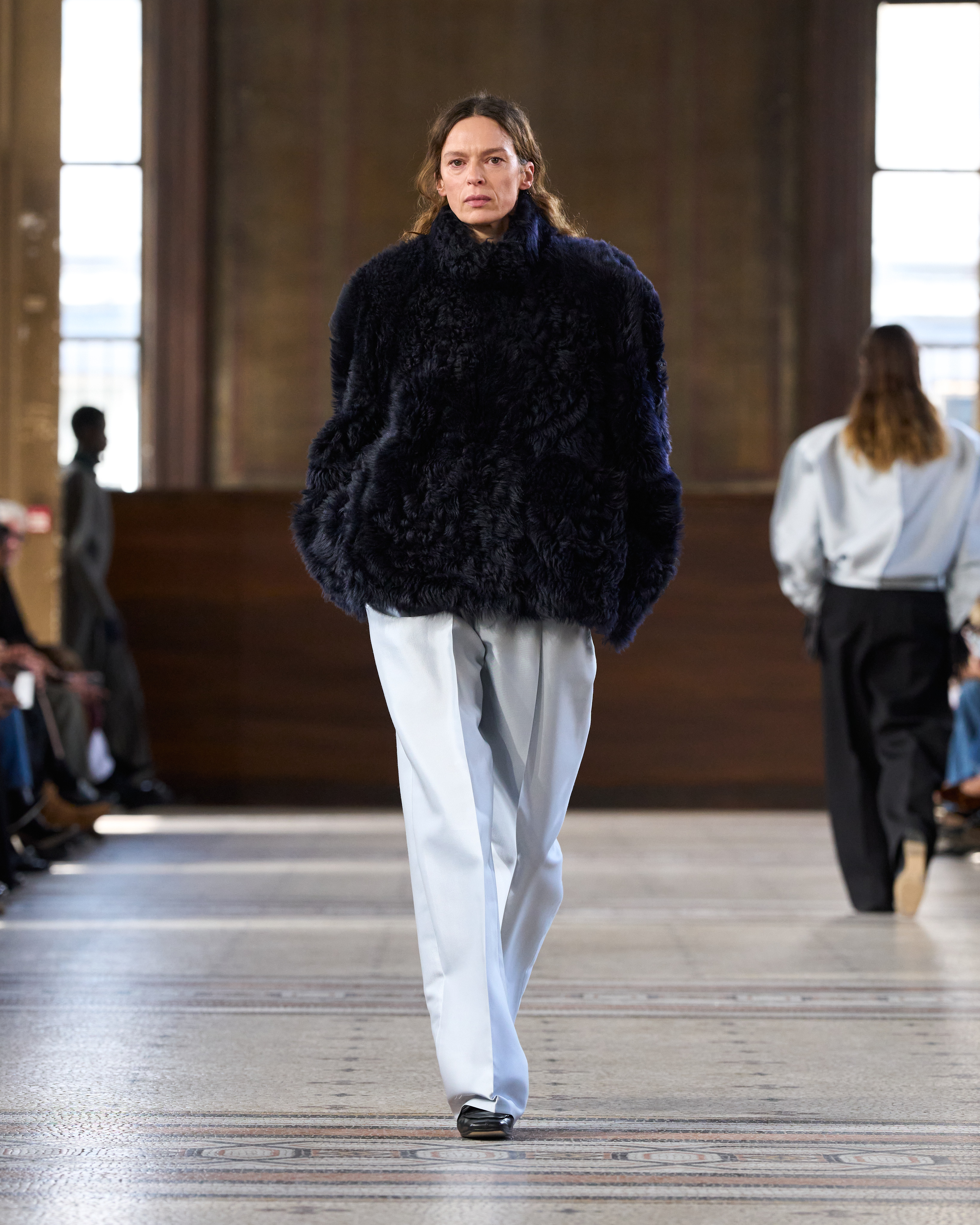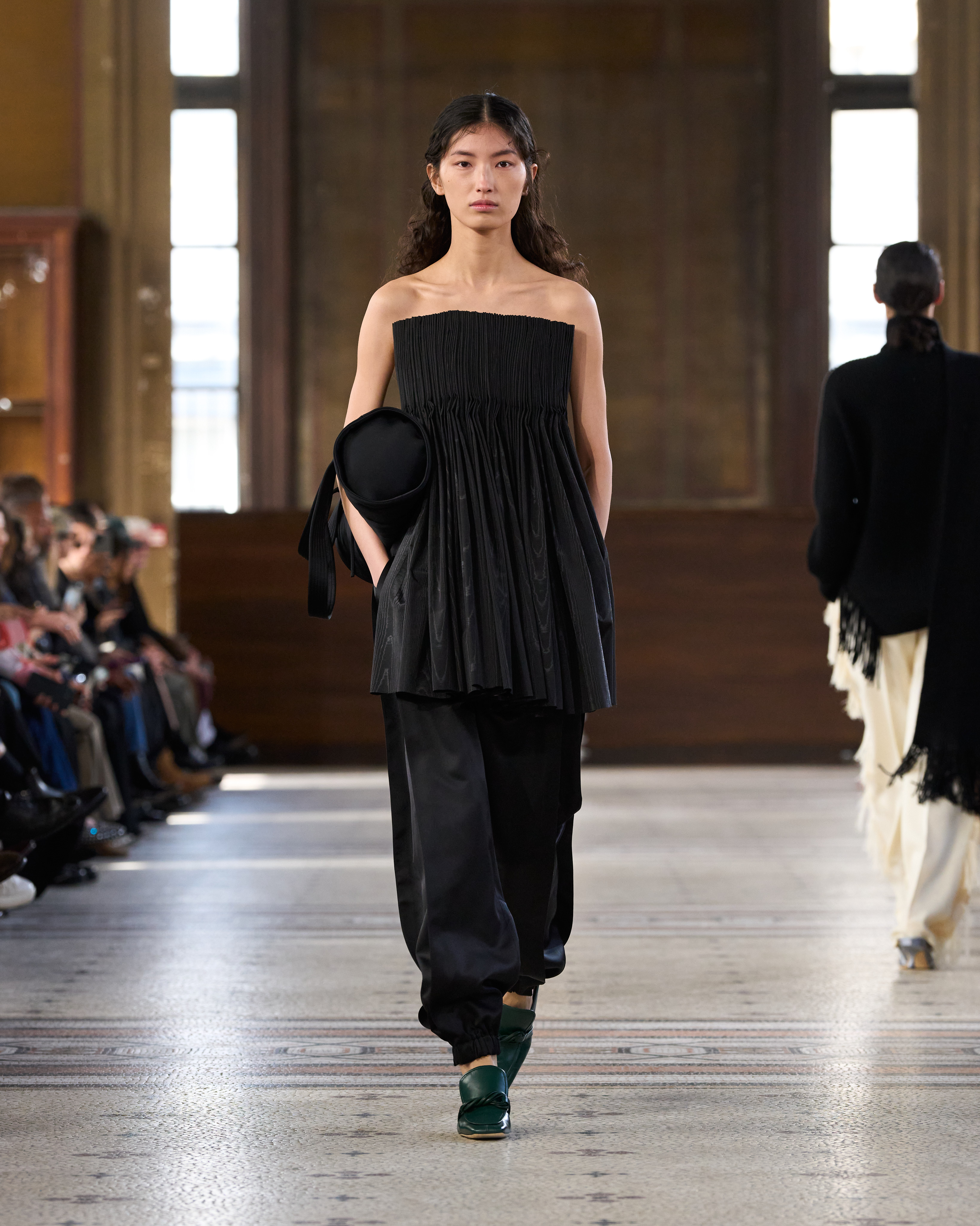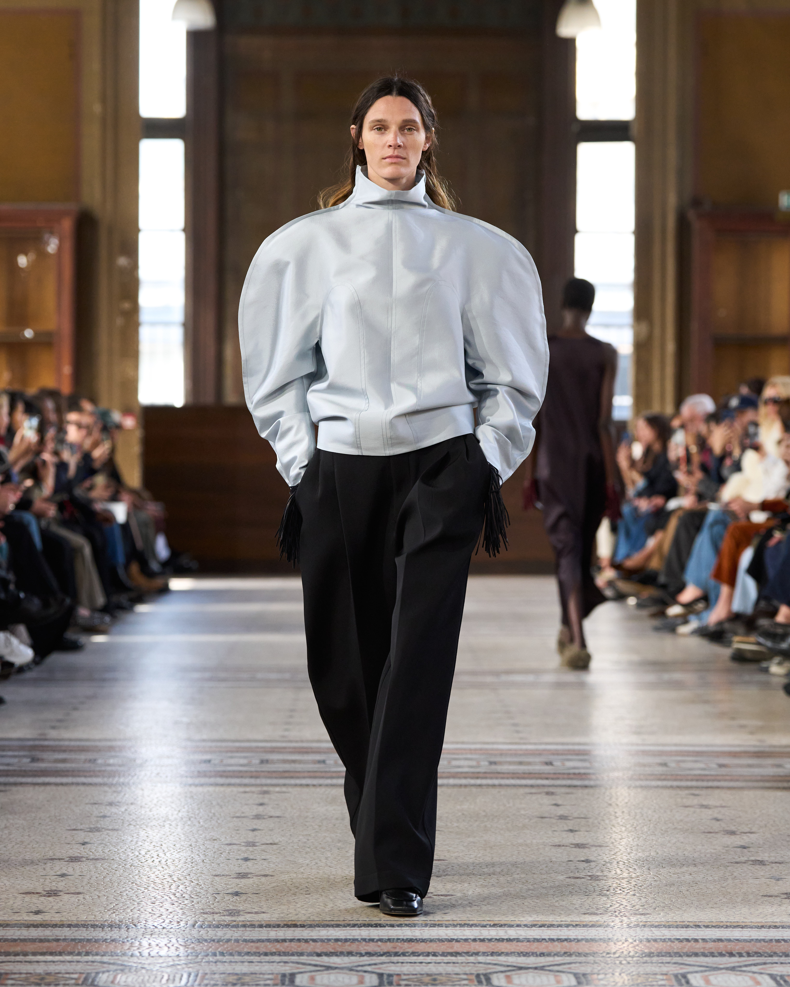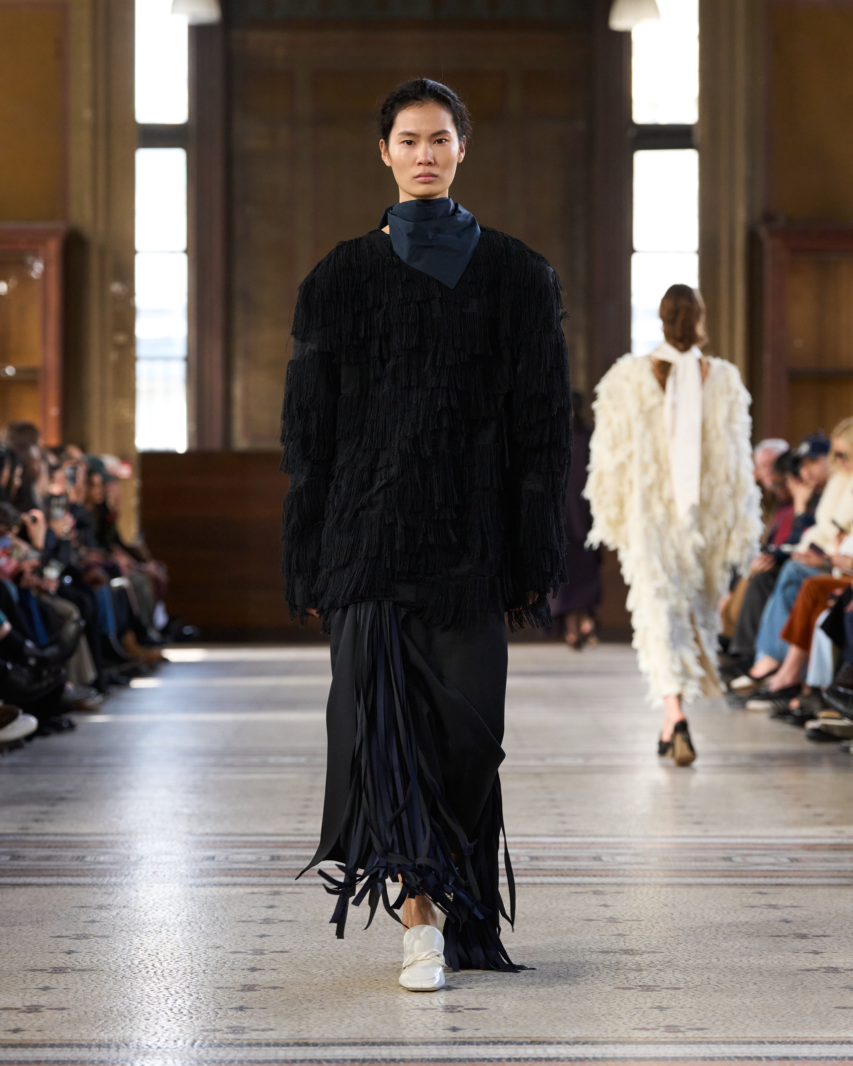 她已装束完毕。赴往某处,步履从容,举手投足间皆有深意。她慎思熟虑,却仍有巴黎 女性的随性,沉静、本能、笃定自持。 系列始于制服式裁剪,精准、权威,近乎严苛。外套的剪裁定义肩线、规整廓形。我从 法式寓所的室内装饰中汲取灵感,以消解这份严谨⸺流苏、织物、壁毯、帷幔与毛毯 ⸺私密空间的元素,暗含松弛、层叠与浸润于日常的优雅。衣着穿行于公共仪式与私 密日常之间。1950 年代的高级定制,为系列注入雕塑感的女性气质⸺弧形肩缝构筑 的圆润廓形,考究腰线,以及对工艺的虔敬。承继上季,我将经典形制以抽象的兰花形 态重新诠释⸺花瓣被解构为体量与褶裥,而非具象的花卉再现。