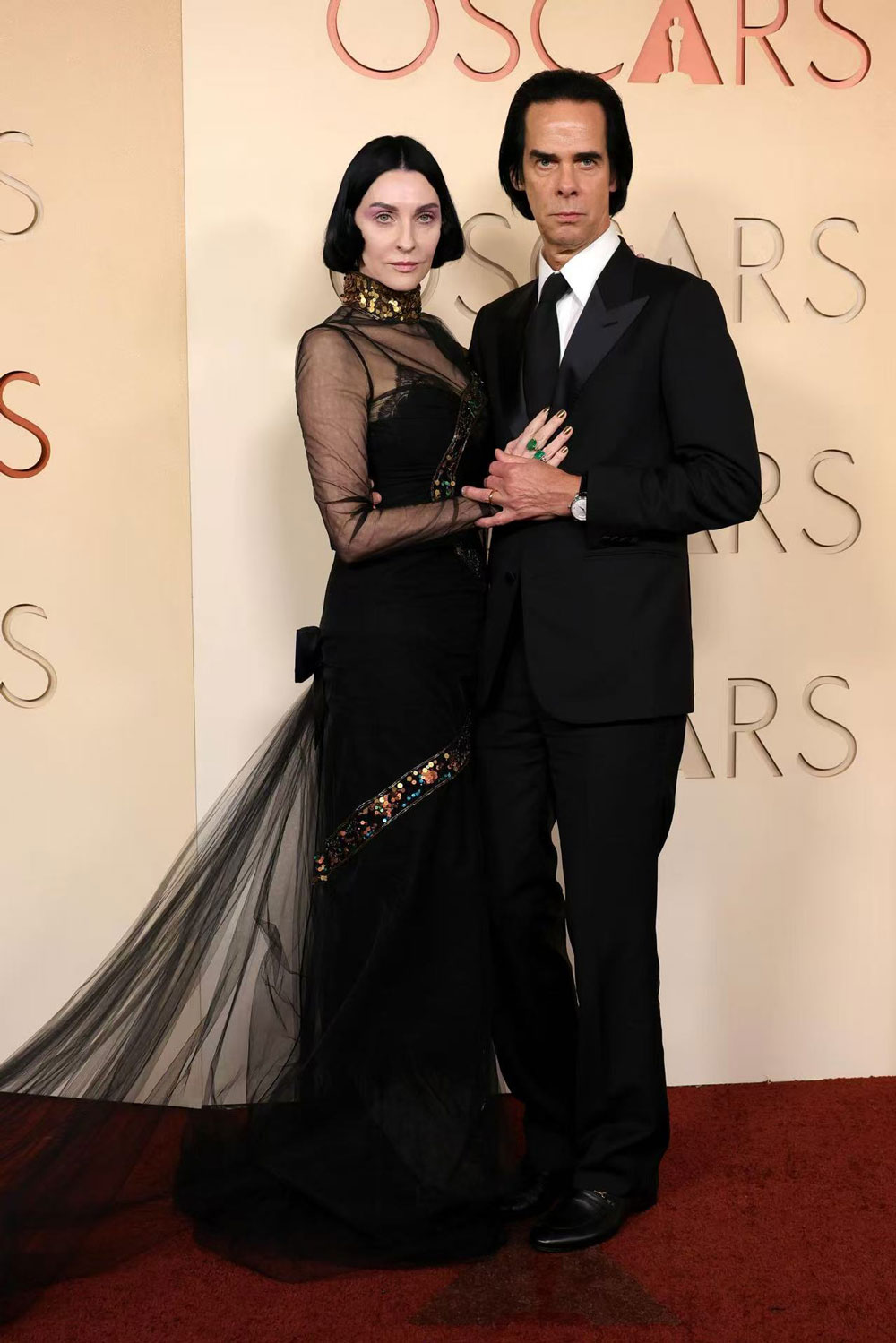 音乐人Nick Cave与模特Susie Cave携手出席第98届奥斯卡颁奖典礼红毯,Nick身着由华伦天奴创意总监Alessandro Michele特别定制的黑色西装,Susie身着华伦天奴2026春夏系列透视长裙,共同注解神秘气质。