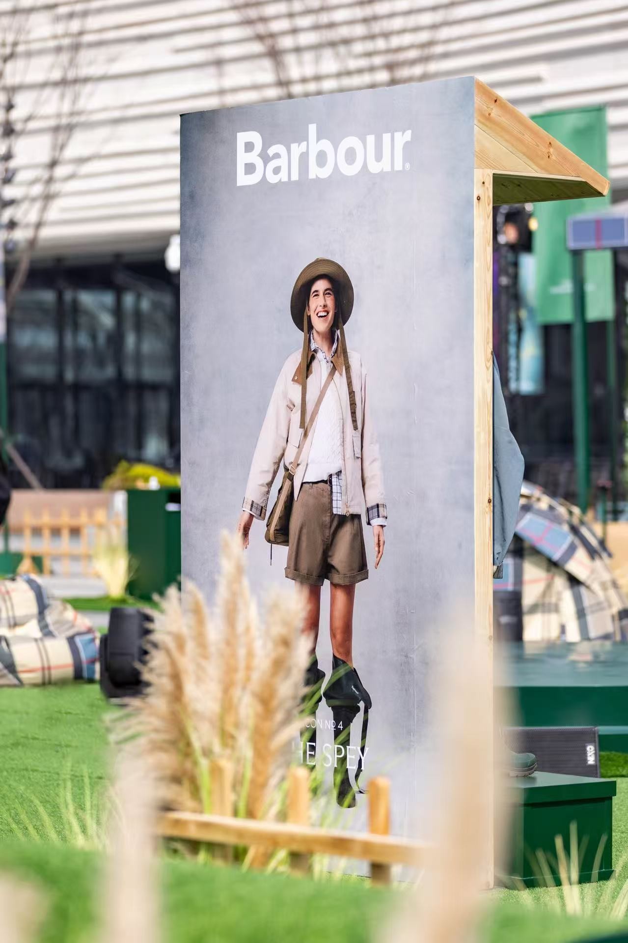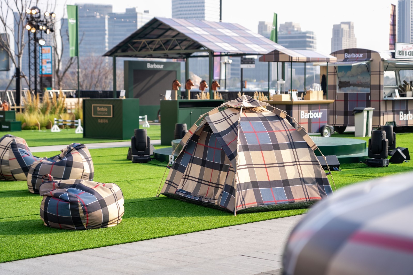 本次Barbour 春迹漫行主题快闪活动选址上海艺术地标西岸梦中心,整体空间设计以春季户外元素与Barbour 经典ICONS 系列夹克设计为灵感,摒弃传统厚重陈设,运用帐篷、豆袋沙发等轻便的户外装备取代传统的木质结构,搭配Barbour 春夏系列的轻盈色系,整体打造出通透、轻盈的自然气息。活动现场的标志性视觉元素取自Barbour Dress Tartan 格纹色系,格纹不再仅是图案,更升华为一种可感知的空间氛围。Barbour ICONS经典系列夹克作为贯穿全场的主角,巧妙地融入各个体验区域,生动诠释品牌理念与日常生活的完美契合。