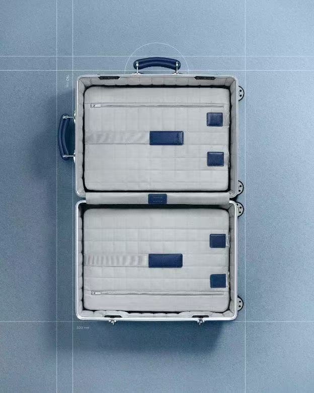 此系列由 RIMOWA(日默瓦)历史悠久的科隆工厂匠心打造,充分彰显品牌在铝镁合金工艺领域的深厚积淀。优雅蓝色的皮革把手,色彩灵感源自品牌档案馆中的经典蓝,赋予该系列独特个性与传承底蕴。镀钯锁具、镌刻着标志性飞机图案的银色铆钉、多轮系统、无级伸缩拉杆等标志性经典元素,则确保了旅途中可便捷使用的卓越性能。内衬徽标上镌刻的独立编号及可定制的皮革行李牌,进一步彰显了Classic Grid 经纬系列的隽永特征。