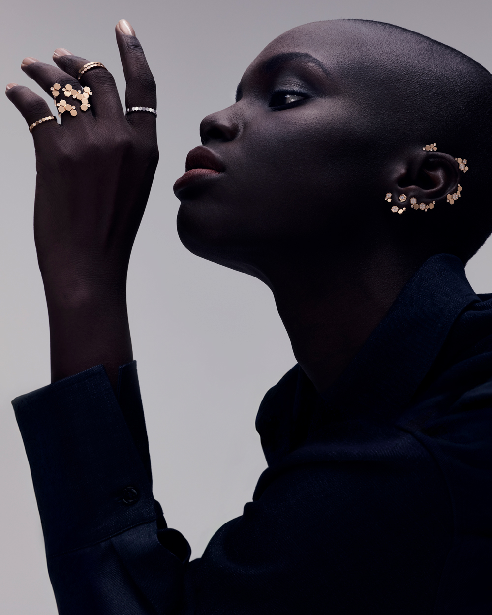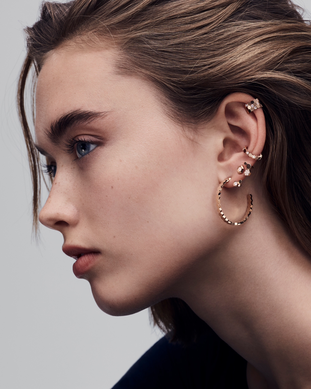 两款耳饰同样别具巧思:一款耳饰以金质与钻石自上而下勾勒耳廓,为面庞增添明亮光采;另一款则提供更灵活的佩戴方式,可选择以一枚或多枚蜂巢图案点亮耳垂,定义不拘一格的率性风范。与之相映的还有一枚更为随性的镂空开口戒指,镜面抛光金质缀以细腻钻石,令整套璀璨之作更臻完整。