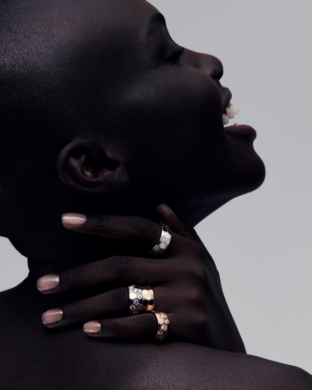Bee de Chaumet系列新添四款玫瑰金臻作,取意自天然蜂巢的多样形态,尽释精巧丰盈而又前卫大胆的魅力。融汇镜面抛光工艺、密镶工艺与包镶钻石工艺,新作巧妙玩味光影与立体感。其中一款戒指以极具当代感的造型铺陈于手背,并以璀璨钻石点睛,令轮廓更显鲜明,举手投足间自成焦点。