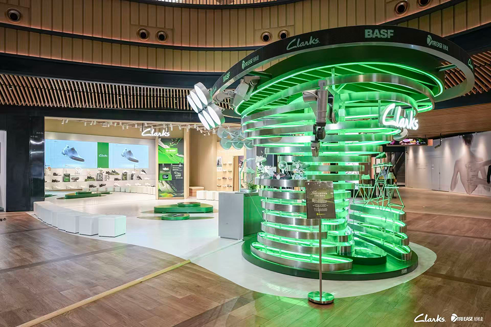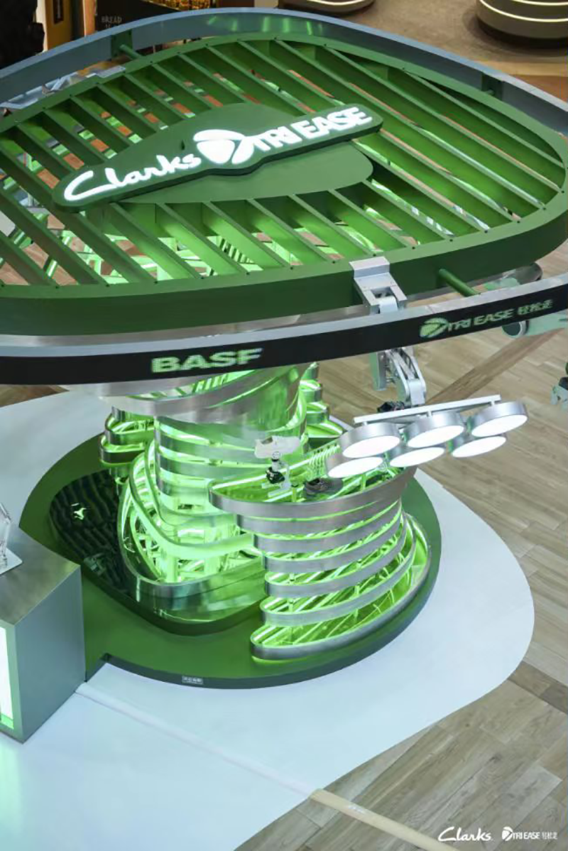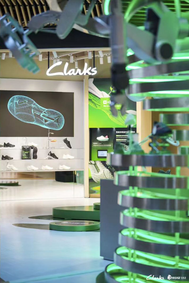 空间的视觉叙事,始于外场的一座“能量脉络”未来感装置。它跳脱了传统静态陈列的框架,以机械臂与能量等高线,构建了一个持续“生长”的、充满未来诗意的有机体。其灵感内核植根于“一生二,二生三,三生万物”的东方哲思,凝练地诠释了Clarks与巴斯夫联合研发的核心理念:一为品牌对“行走”本质的深究与实验,二为诞生于理念下的TRIEASE轻松走鞋履,三则是支撑这次“行走再进化”的三大科技革命。整个装置由两部分构成:一部分源自TRIEASE轻松走的AIGC宣传片,将脚部的压力、能量等生物力学数据,转化为流动的等高线图谱,呈现出充满未来感的“机能美学”;另一部分则是冷静运转的自动化机械臂,精准复现着“立体喷涂”的核心工艺。一动一静之间,宣示着品牌对未来步行方式的构想——更高效、更科学、更可持续。生机绿作为主视觉色彩贯穿始终,渲染出兼具理性与生命力的独特氛围。