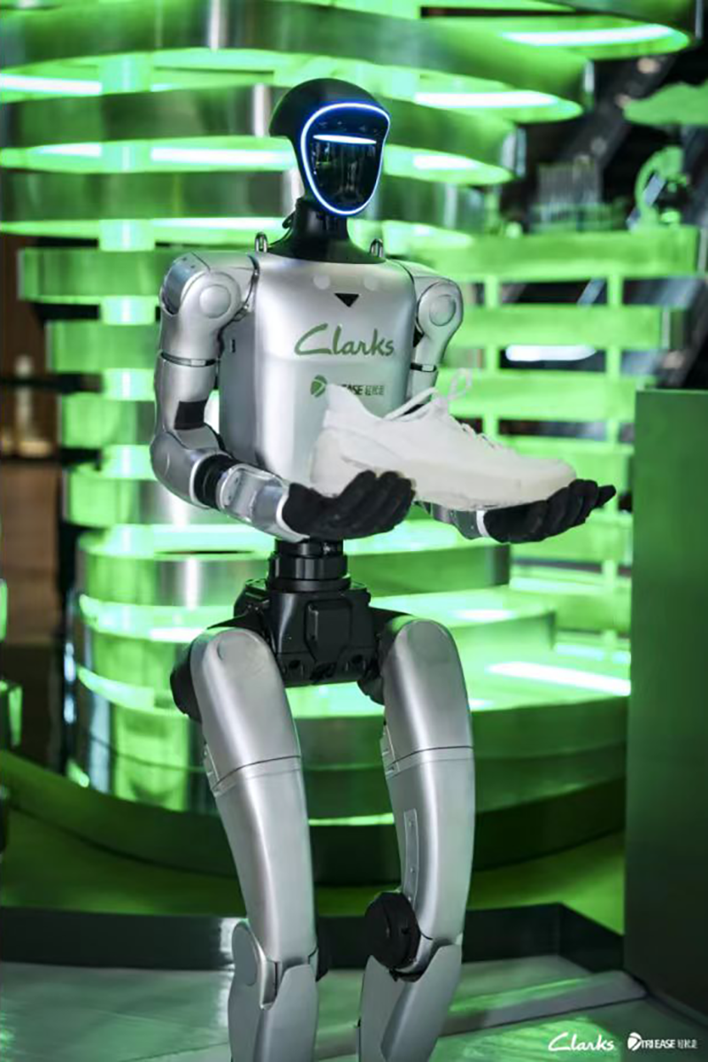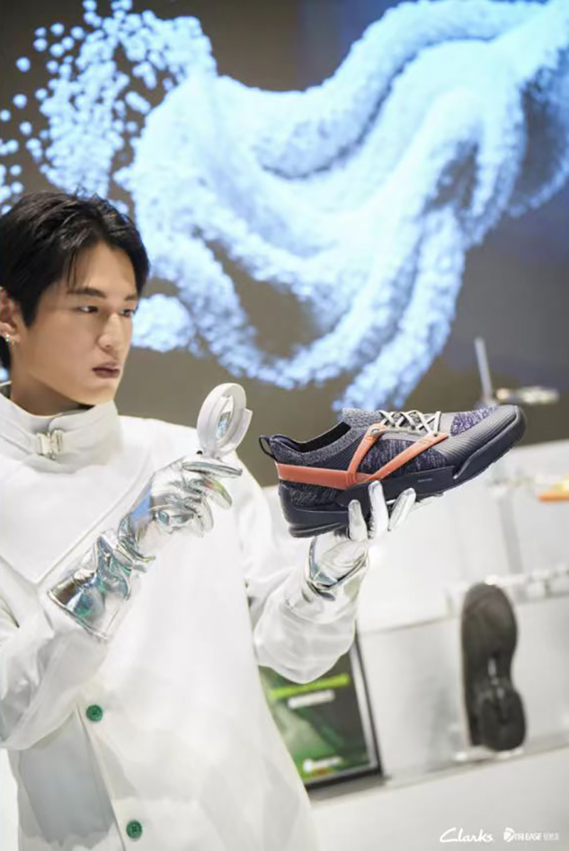 整场发布,被打造为一次极具先锋感的沉浸式创意秀。它超越了传统T台与定点的限制,模特是这场实验的主角——他们身着白大褂,以未来科研人员的姿态散落在空间各处,并将TRIEASE轻松走产品作为核心“实验样本”,以行为艺术的方式呈现。随着实验进程进入高潮,他们同步脱去实验外衣,以充满未来感的造型,释放松弛而自信的时尚能量。TRIEASE轻松走系列在这群“未来行者”脚下,完成了从理性解构到感性释放的完整叙事。秀的终章,两位机器人携新鞋登场,Clarks大中华区总经理Rebecca Chen女士与巴斯夫亚太区鞋履/运动/休闲业务总监吴小军博士一同,将承载着数据与理念的TRIEASE轻松走嵌入核心装置。顷刻间,装置脉络与嘉宾手环同步点亮,象征着舒适科技的进化图谱被正式开启,一场关于行走的未来实验,就此启程。