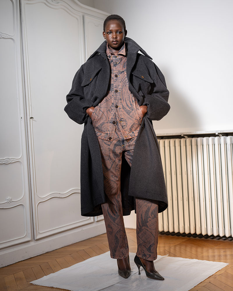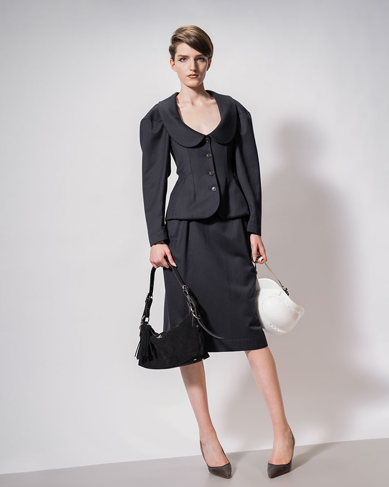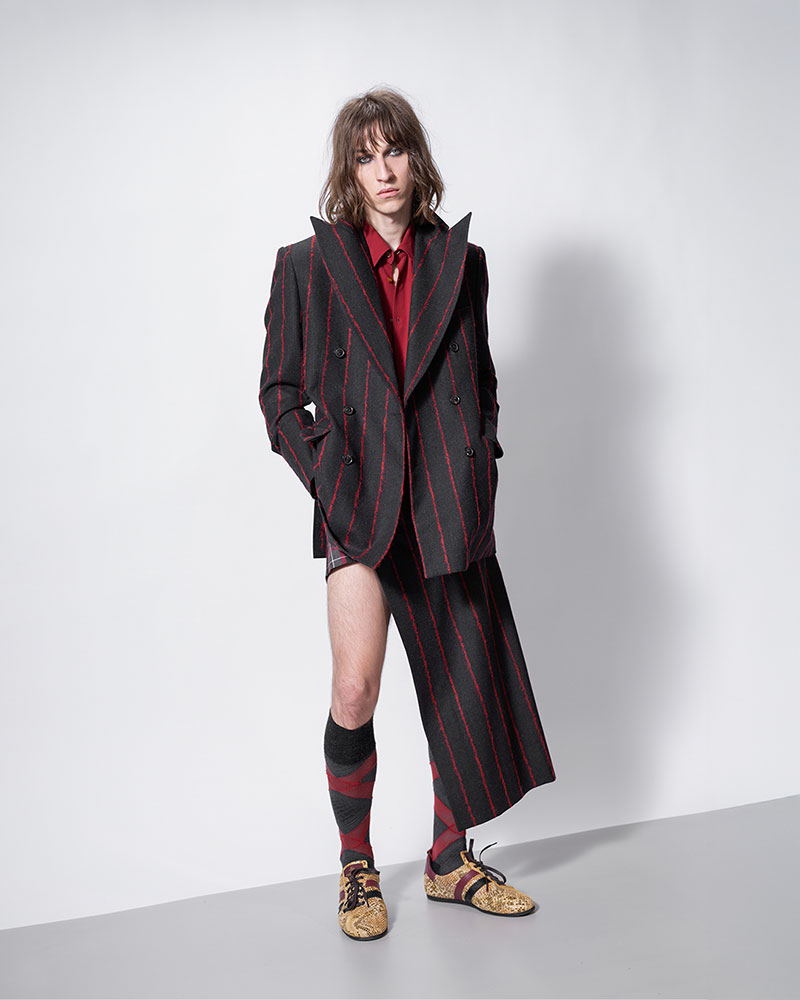 一种隐约的感官张力贯穿全系列:若隐若现的腿部线条、长筒袜与吊带袜元素,均取自Andreas Kronthaler for Vivienne Westwood巴黎秀场。厚实的麦尔顿大衣包裹着垂坠金属纱派对裙装,深色西装剪裁中点缀猩红细节。将日常与欲望并置——女性形象于职场与居家语境中不断切换与重构。