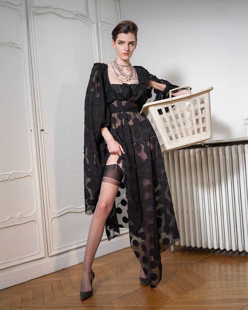 该系列造型手册延续这一二元对立,如同一部当代语境下的《坎特伯雷故事集》,人物沉浸于日常情境之中。明暗交织——褶皱感府绸的夸张剪裁,与几近透明的波点薄纱及提花薄纱连衣裙并置呈现。