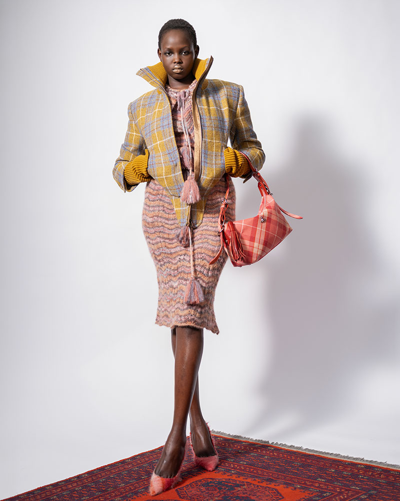 Vivienne Westwood 2026秋冬系列以英格兰及其历史为灵感——开袖设计与束身针织令人回溯至汉斯·荷尔拜因(Holbein)笔下的都铎宫廷肖像。狩猎马裤与格纹灯芯绒拼接组合,柔美针织开衫套装与野餐毯格纹剪裁相互交织。