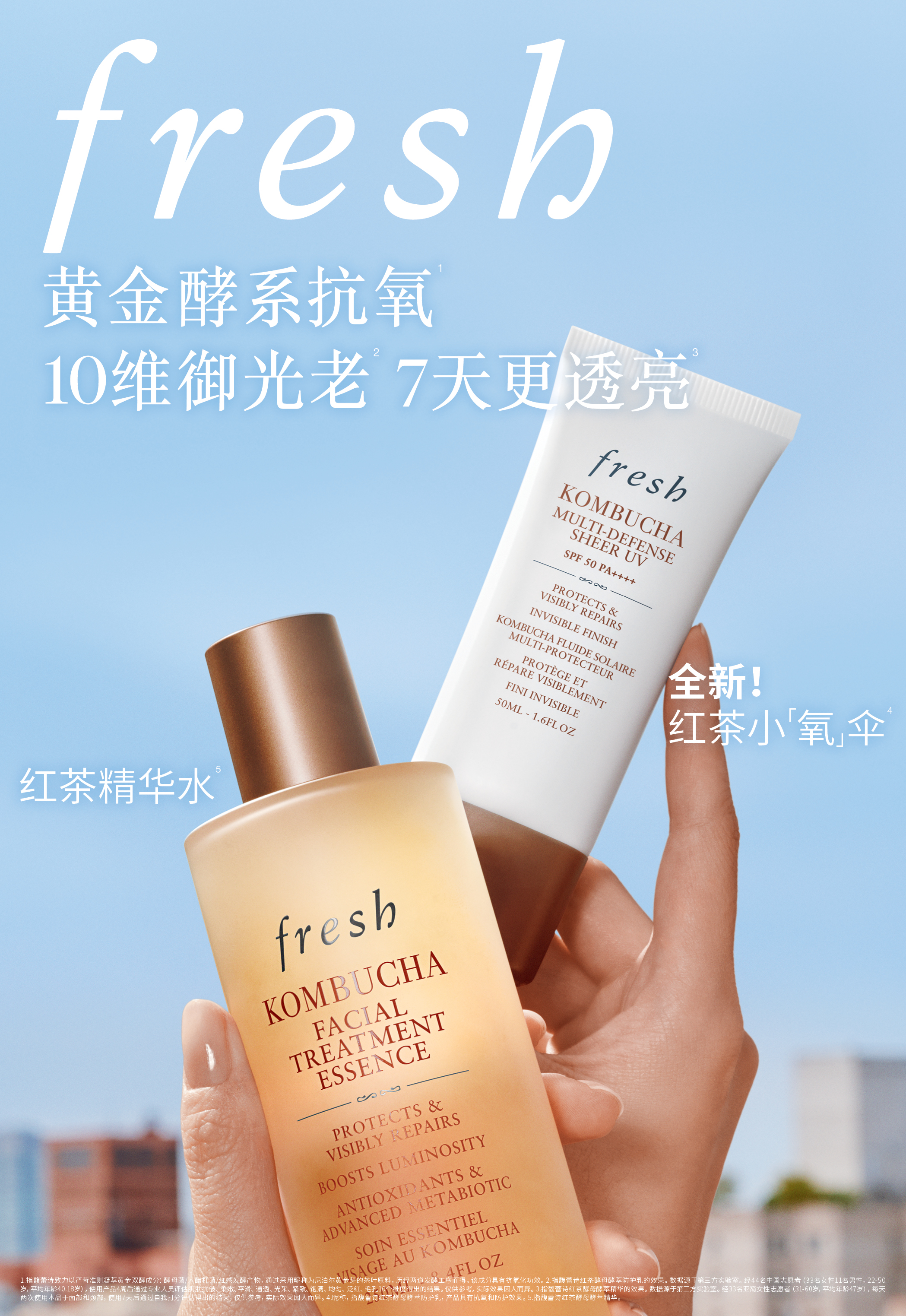 2026年4月,LVMH集团旗下高端护肤品牌fresh馥蕾诗重磅推出首款酵系4抗氧防晒产品——红茶酵母酵萃防护乳(红茶小「氧」伞1)。延续品牌在护肤领域的深厚积淀,新品fresh馥蕾诗红茶小「氧」伞1整合突破性防晒理念,不止高倍防晒,更氧肤5抗光老,以专研酵系防晒科技6为核心,将防晒、抗氧与修护三重效果整合,实现了黄金酵系抗氧2,10维御光老3与一酵更透亮3的显著功效。在高指数的同时帮助肌肤修护光老化痕迹构建防护体系,从而实现护肤般的防晒体验。