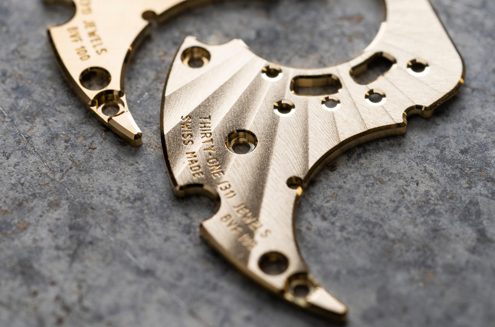 这款腕表的构造与润饰同样体现了品牌对精致细节的不懈追求。若细致品鉴便会发现,八角形螺丝采用了新的轮廓设计。机芯的润饰工艺一丝不苟,尤其体现在表桥与主板上——其饰以放射状日内瓦波纹,这种纹饰比传统的直线形日内瓦饰纹更为少见,对工艺的要求也更高。