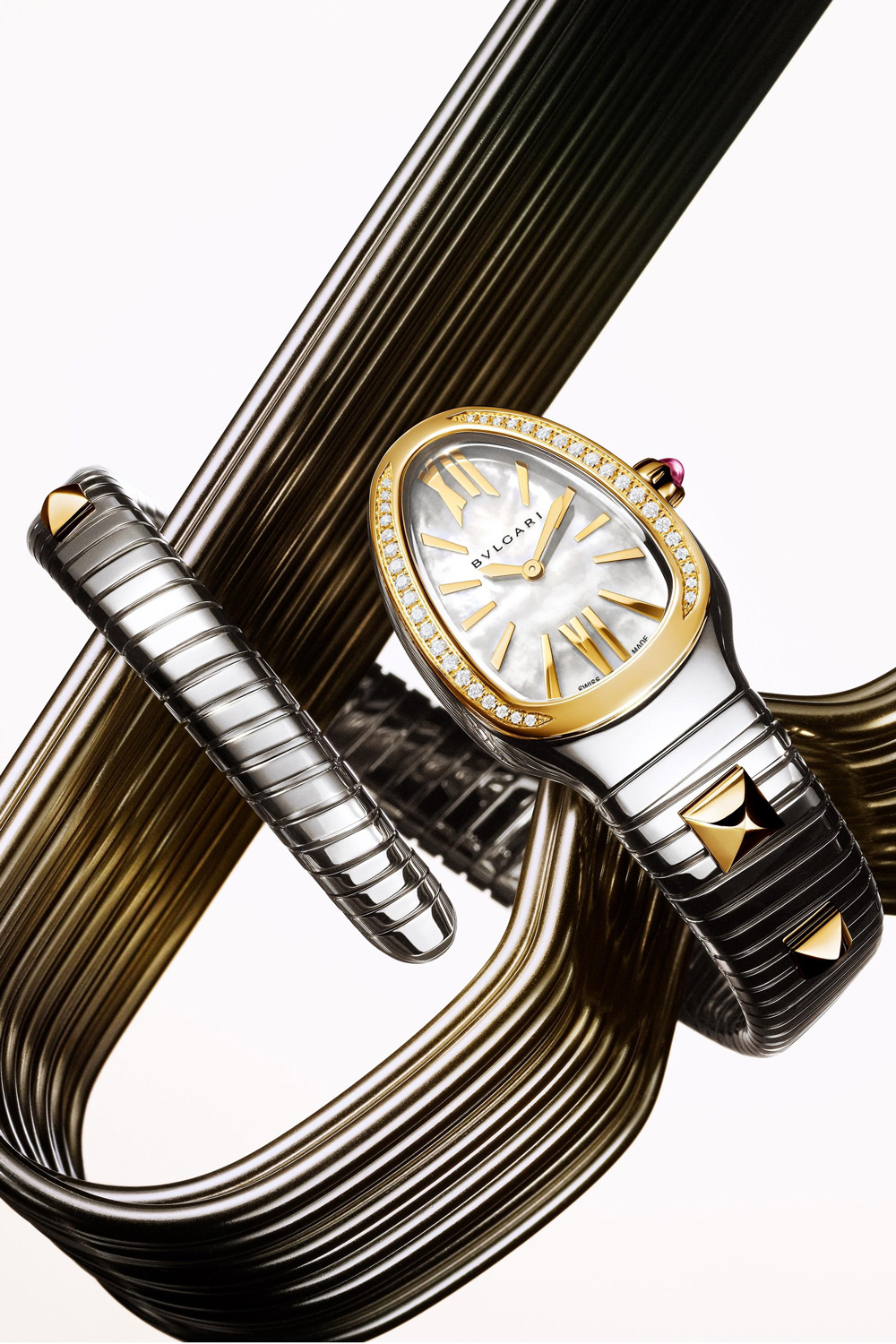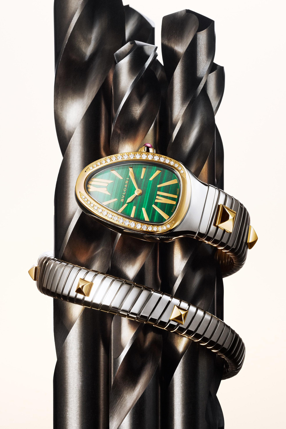 20世纪40年代,品牌Serpenti系列腕表携Tubogas表链一同问世,展现出工业设计与珠宝艺术的创意交融。Tubogas工艺以精细金属条带的精准缠绕为基础,于20世纪70年代逐渐成为品牌的设计标识之一。伴随Tubogas工艺的发展,“金与精钢”的理念亦随之确立。宝格丽秉持这一创作构想,围绕材质与表达的张力展开探索。金的华贵质感与精钢的坚实特性于此交织辉映。此种经精心掌控的对比源于高超的技艺水准,那是一种植根于品牌创见的美学实践,持续滋养着宝格丽的创作表达。