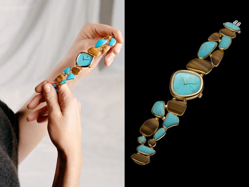 首款作品的创作灵感汲取自汝山谷的自然景致。新作名为“ÉtablisseursGalets鹅卵拾光”腕表,令人联想到经汝湖(Lac de Joux)湖水冲刷打磨成形的圆润卵石。此款时分显示腕表采用18K黄金打造,配备椭圆形天然宝石表盘。链带由形态各异的链节组成,每一枚链节均镶嵌宝石,彼此之间以微型金质球形关节相连,随着腕部动作灵活转动,宛如水流中的卵石般灵动自如。表盘采用简约设计,未设任何时标,着意凸显天然宝石的纹理美感。盘面点缀以黄金制成的AP字母标识和棒状指针,营造出撞色效果。新作从1972年的Arabella腕表中汲取灵感,搭载Calibre 3098机芯。此款机芯衍生自爱彼于1999年自主研制的首款机芯——9法分Calibre 3090机芯。新款机芯的设计依循表壳的卵石造型,桥板采用独特珍罕的手工粒纹工艺打磨装饰。腕表将精妙的珠宝艺术、制表技艺与宝石切割工艺融为一体,由同一位制表师完成组装、调校和表壳装配工序,延续了分工协作制表时代的组织模式。此款新作将于2026年推出五种不同天然宝石组合的款式。