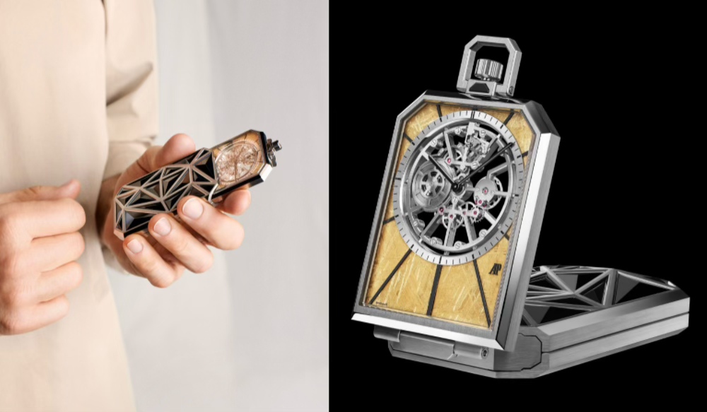 第二款作品为“ÉtablisseursNomade漫行者”怀表,致敬多用途时计的创作传统。无论置于衣袋中,还是摆放于桌面上,这一作品皆可展现其独特风采。新作采用多面切割的金属材质(钛金属或黄金)与精心甄选的天然宝石制成。由于石材质地脆弱,必须运用细致入微的工艺,方能塑造出理想形态。宝石工匠采用切割、打磨与抛光工艺,耐心地进行雕琢,确保宝石精准契合整体结构。怀表可呈现三种状态:表盖闭合、表盖开启或悬垂,并配备特别设计的钛金属或黄金链条。时计的核心亮点在于Calibre 7501机芯。该款机芯以2022年问世的超薄Calibre 7121机芯为基础研制,采用传统手工微型钢锯进行镂空处理。机芯兼具通透质感与对称布局,桥板同时兼作时标,用于显示时间流转。手工镂空是一项极具挑战性的工艺,唯有少数制表师能够娴熟掌握。这一技艺对精准度与耐心的要求极高,尤其是手工打磨内角的工序更是繁琐。爱彼自1930年代以来便悉心传承这一精妙工艺。时计的外层表盘以天然宝石打造,嵌入由斜面金属网格与多面切割宝石构筑成的建筑感表壳中。此款作品将于2026年推出五种不同天然宝石组合的款式。