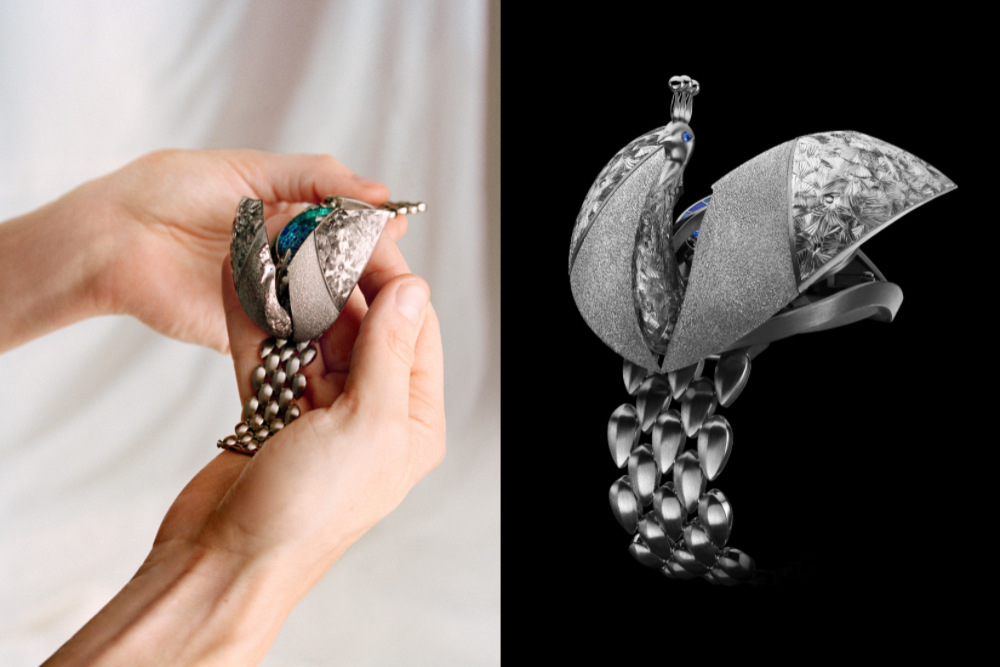 第三款为“ÉtablisseursPeacock雀影羽翎”腕表,以精巧华丽的设计,重释隐秘式时计的隽永魅力。腕表闭合时,呈现以白金精雕细琢的甲虫造型;轻轻一按,其翅膀与头部徐徐展开,一只手工打造的微型孔雀随即显现于眼前。双翼之间展露出一枚手工精雕的半透明珐琅表盘,象征孔雀的华丽尾羽。表盘上的视窗呈现由Calibre 3098机芯驱动的拖曳式小时显示。此款机芯以经典的Calibre 3090机芯为基础,专为新款腕表特别构思研制,并采用手工雕刻放射纹装饰。腕表搭配柔韧的白金链带,由数十枚精心雕刻的镂空羽毛造型链节组成。珠宝工艺大师、珐琅大师、雕刻大师与制表师通力协作,打造出这件时计杰作。孔雀双眸镶嵌彩色宝石,为整体设计更添华贵神韵。此款作品将于2027年推出三种不同款式。