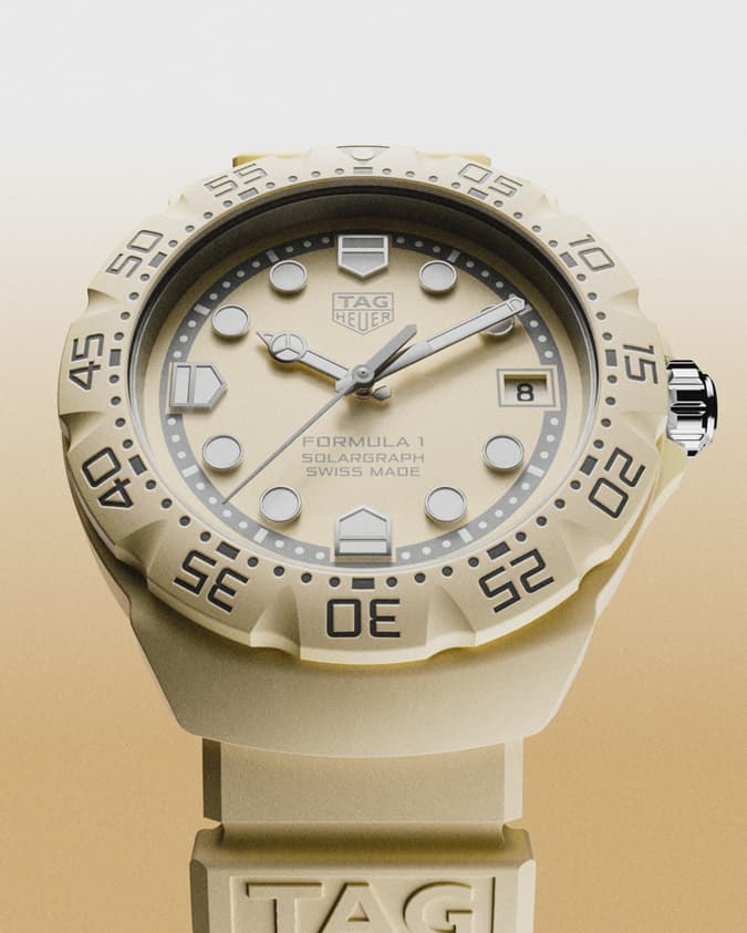 泰格豪雅 F1 系列太阳能腕表 38 毫米款,搭配燕麦黄瓷漆表盘,全球限量 3,500 枚,散发着低调温润的质感。和谐的配色令人联想到阳光洒落于表面的从容优雅,微妙的色彩对比勾勒出盾徽的几何轮廓与冷灰色分钟刻度圈的理性美感,最终呈现出一种既宁静从容、又自信鲜明的独特气质。