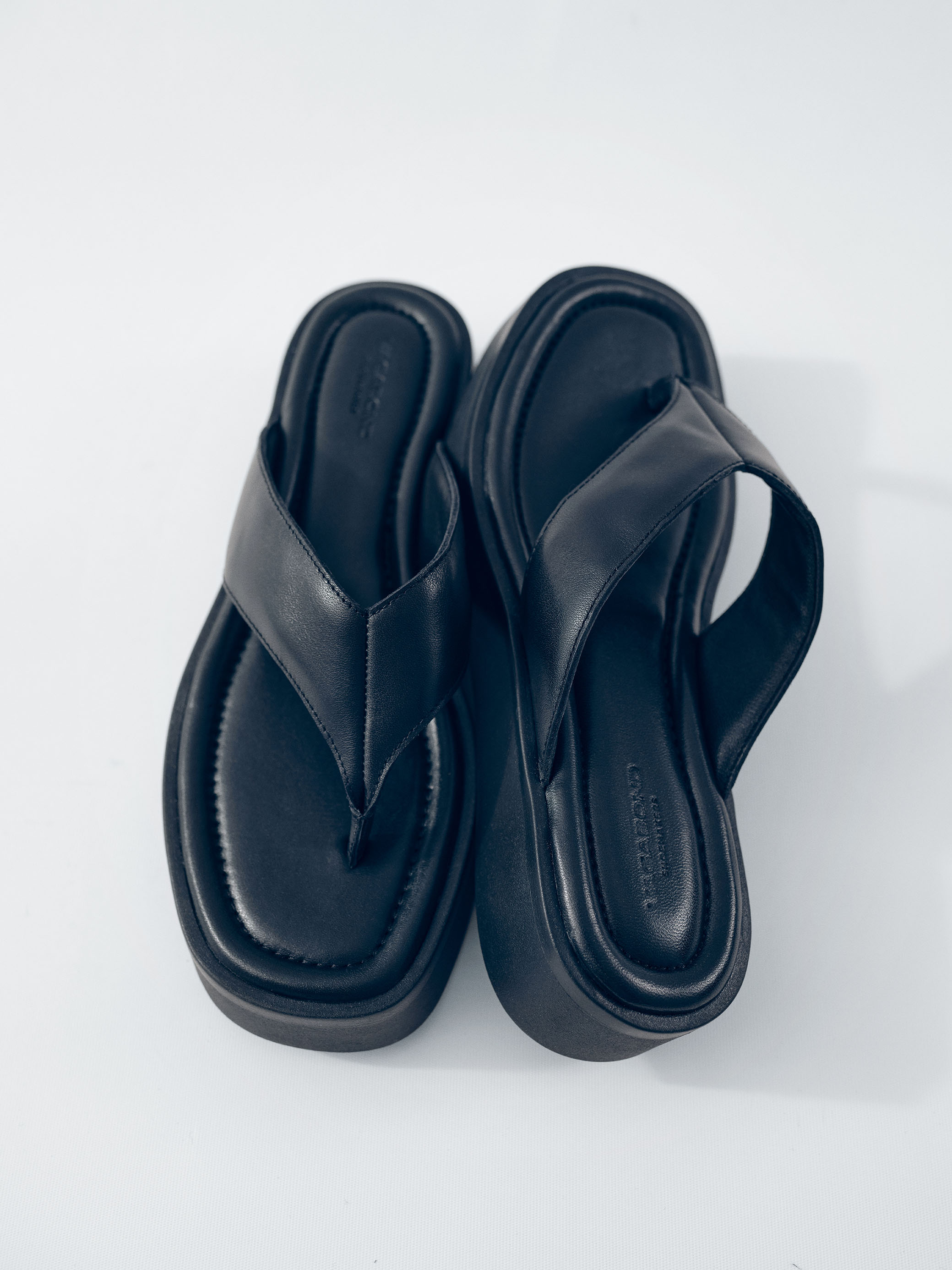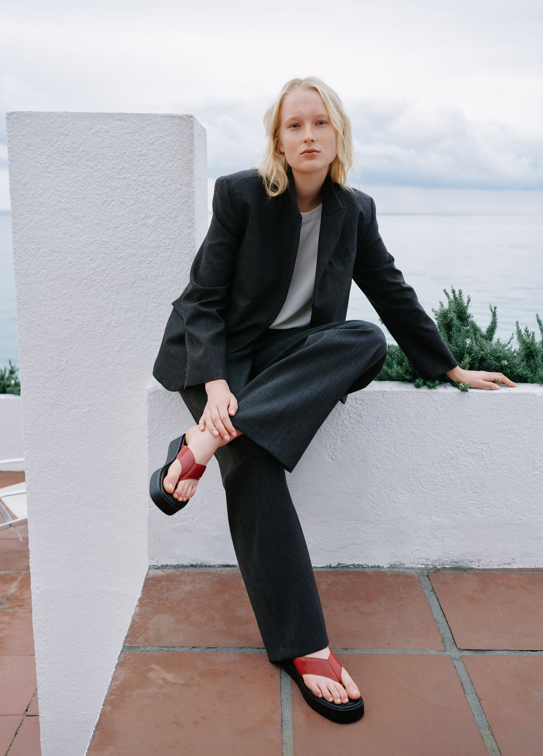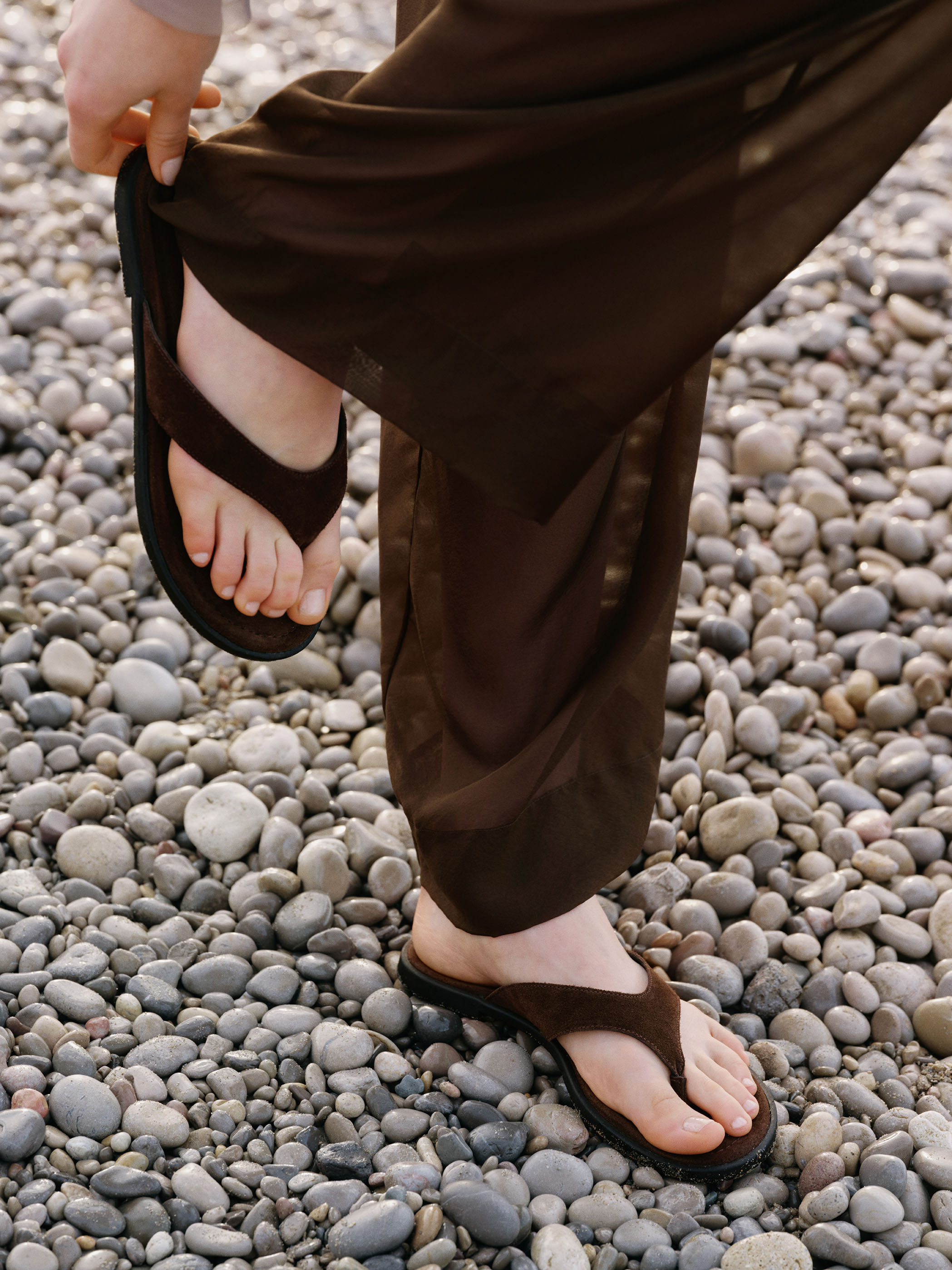 Danya作为本季主打款,以厚底人字拖呈现,承载着强烈的Vagabond品牌基因。Danya通过经典黑色皮革与醒目的红色擦色皮革两种表达,为系列注入鲜明个性。 Zaida则以纤薄鞋底勾勒轻盈轮廓——棕色麂皮材质搭配人字拖鞋面设计,流露随性优雅气质;黑色皮革款人字拖鞋面带有可调节搭扣设计,使整体更具功能性与层次感。