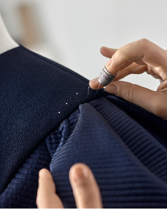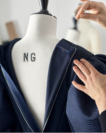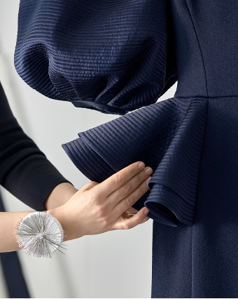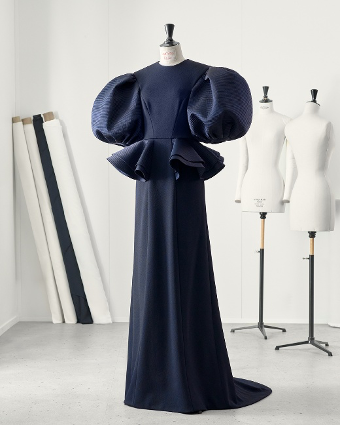 该件路易威登定制圆领泡泡袖长礼服,采用午夜蓝修身绉纱针织面料及同色系轻质丝绸缎。蓬松的袖子和双层褶边部分使用手工绗缝处理,这种工艺使得袖子廓形十分清晰。该件礼服的制作耗时超过300小时。