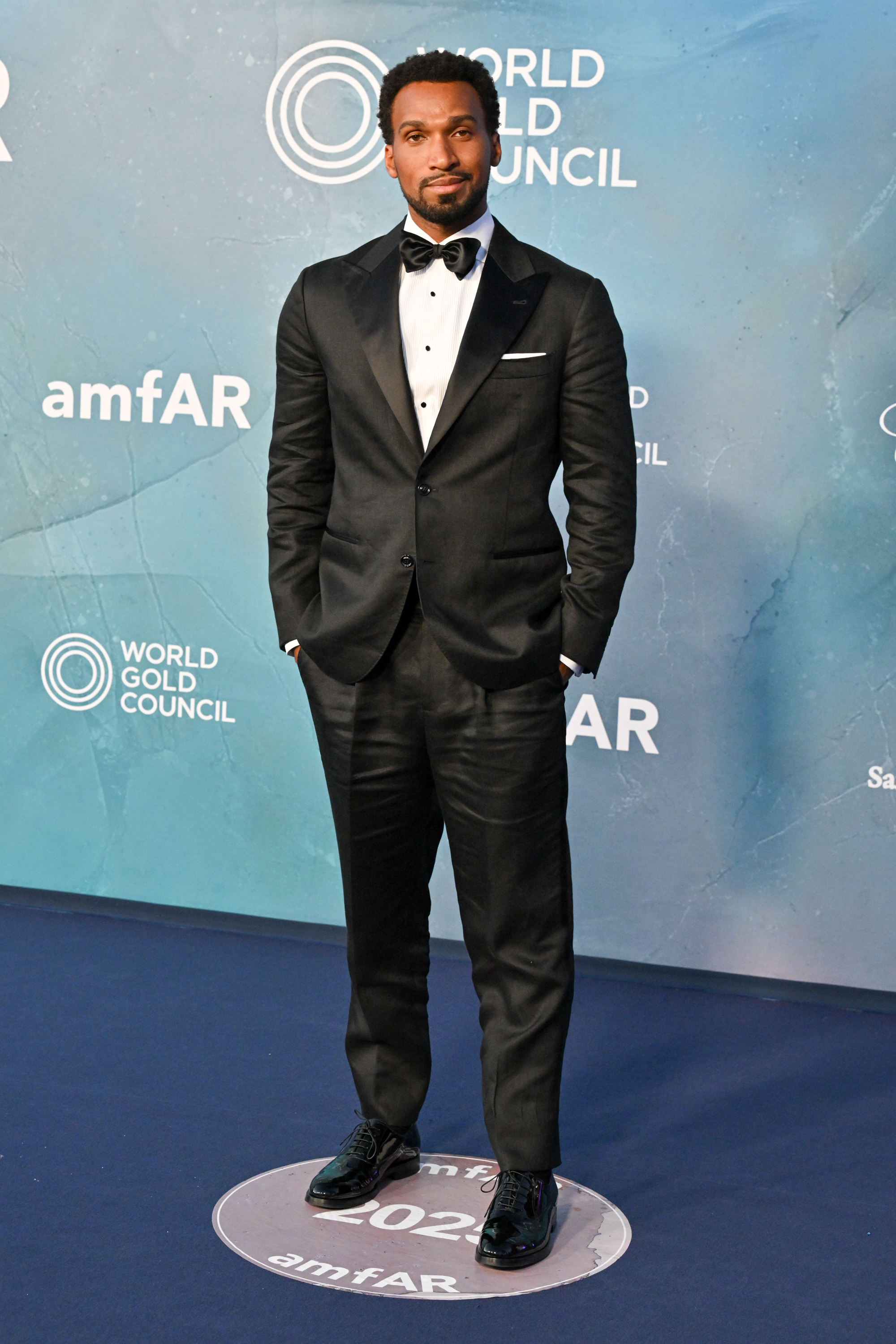 演员内森·米切尔(Nathan Mitchell)身穿Brunello Cucinelli 2025春夏系列纯黑戗驳领羊毛礼服夹克,搭配纯黑羊毛礼服长裤及配饰,亮相第82届威尼斯国际电影节amfAR慈善盛典红毯。