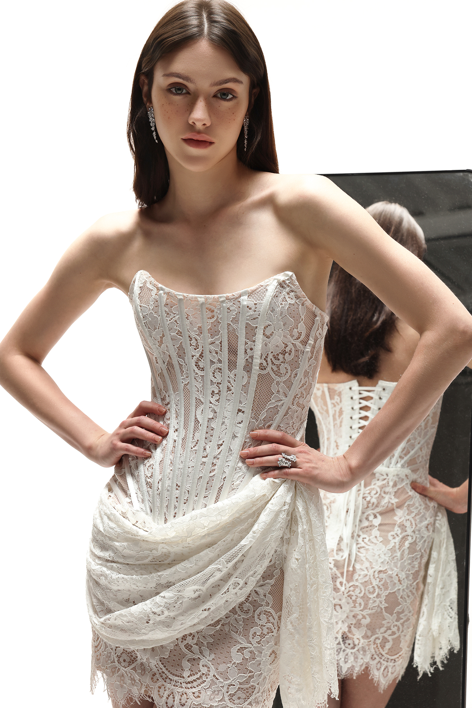 如果鱼骨裙是力量的语言,那么蕾丝裙便是质感的诗篇。蕾丝,本是浪漫的代名词,但在Skye&Iris之中,它是一种含蓄而带有呼吸感的美。层叠的纹理,是记忆的肌理,细腻却不繁复,隐含其中的是女性内在的温柔与自持。纤细的针脚,隐约的透视感,都让这份柔软成为了有意识的温柔,让每一片花纹都包含克制的情感与难以言说的温度。Skye&Iris在蕾丝裙的设计中模糊了布料和肌肤之间的距离,既是遮掩,也是表达,既成就了蕾丝的情感,又让穿着者得以在坚韧与温柔之间自由地切换身份与心境,让女性能在温柔中拥有力量,在克制中流露情感。