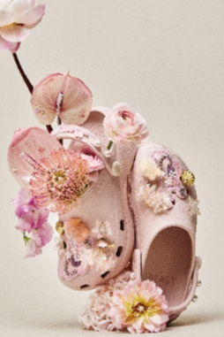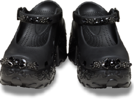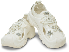 Simone Rocha x Crocs 路野鞋则成功打破了机能与优雅的界限。设计在Crocs经典户外基因的基础上,结合开放式网眼鞋面兼顾透气机能与轻盈质感。该鞋款推出暗黑色与牡蛎白两种配色,鞋面点缀的立体水钻花卉,其设计巧妙平衡了温柔与不羁活力,于对比中彰显出大胆而前卫的格调。