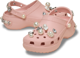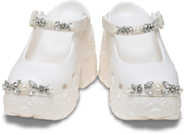 此次联名合作推出了全新Simone Rocha x Crocs Ballerina Platform洞洞鞋,其廓形灵感源于Crocs卡骆驰经典的人鱼洞洞鞋,在缀以珍珠与水钻装饰后,整体造型兼具建筑美感、实用性与玩趣态度。源自芭蕾足尖鞋的一体成型压模细节,配以雕塑感外底及灵动优雅的蝴蝶结元素,完美融合了Crocs的实用主义与Simone Rocha高级定制美学的设计语言。